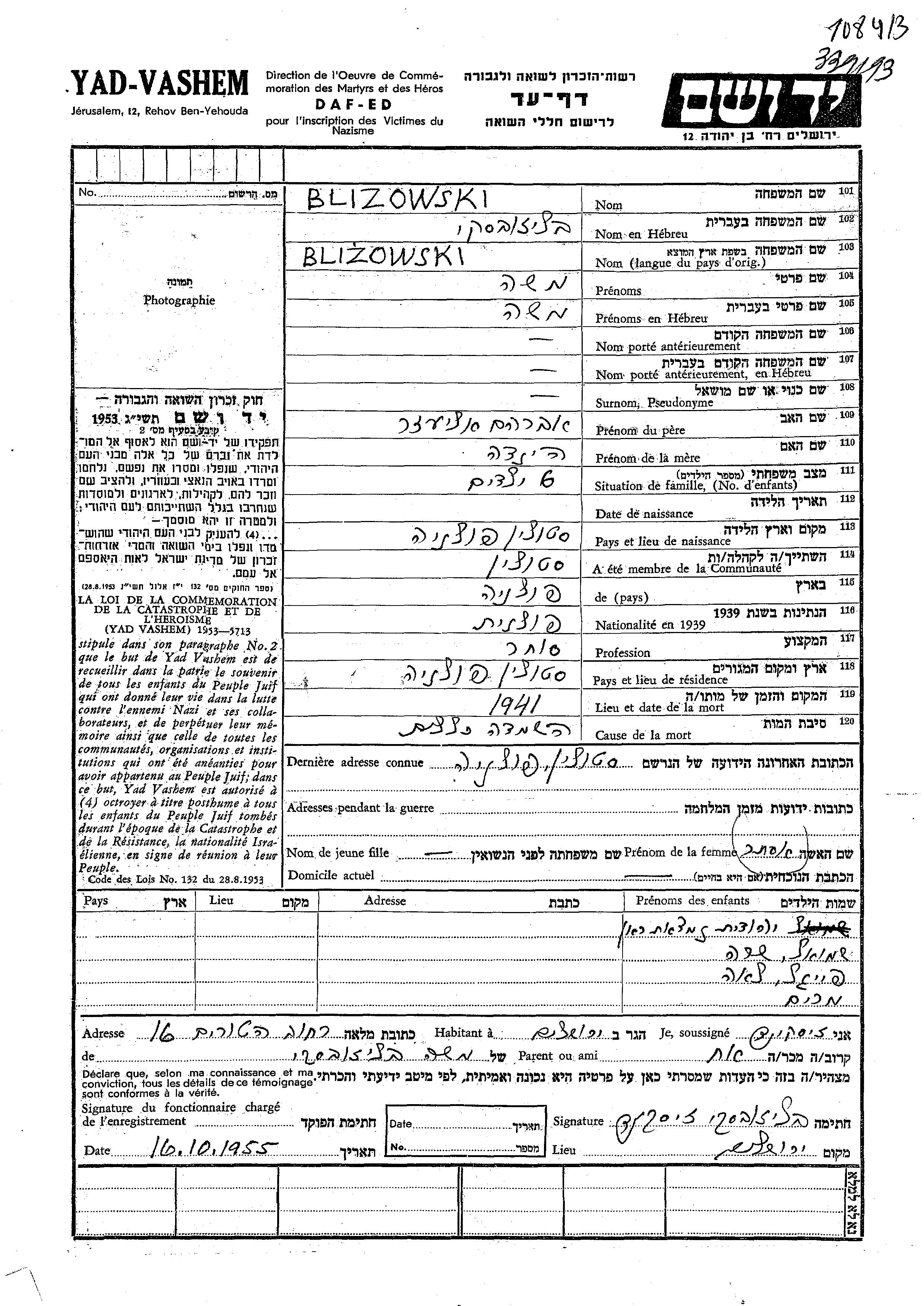 Blizowski Mosze Misha 1906 Stolin, Pologne Feuille de témoignage