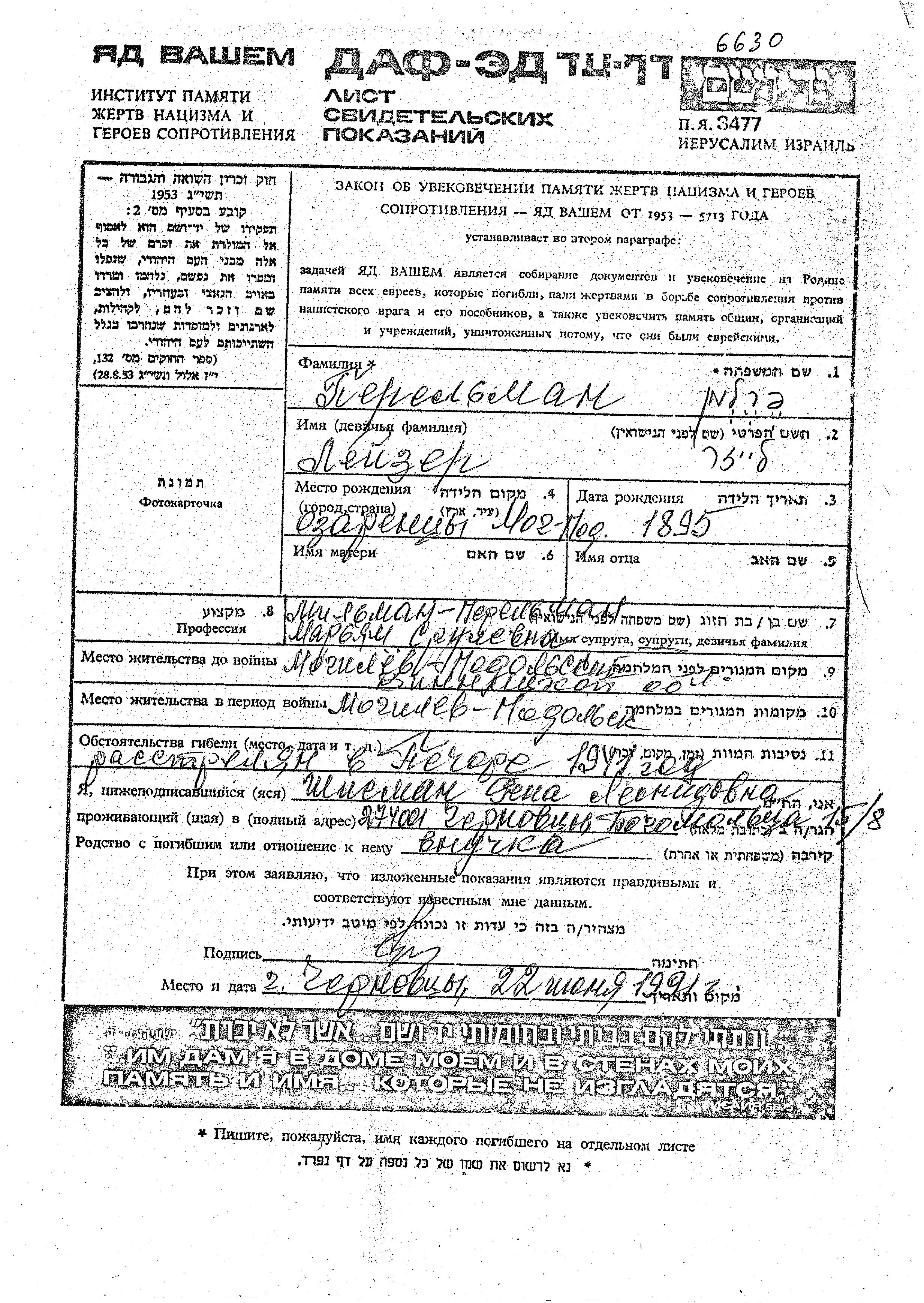 Perelman | Leizer | 1895 | Mogilev Podolski, Ukraine (URSS) | Feuille de témoignage |