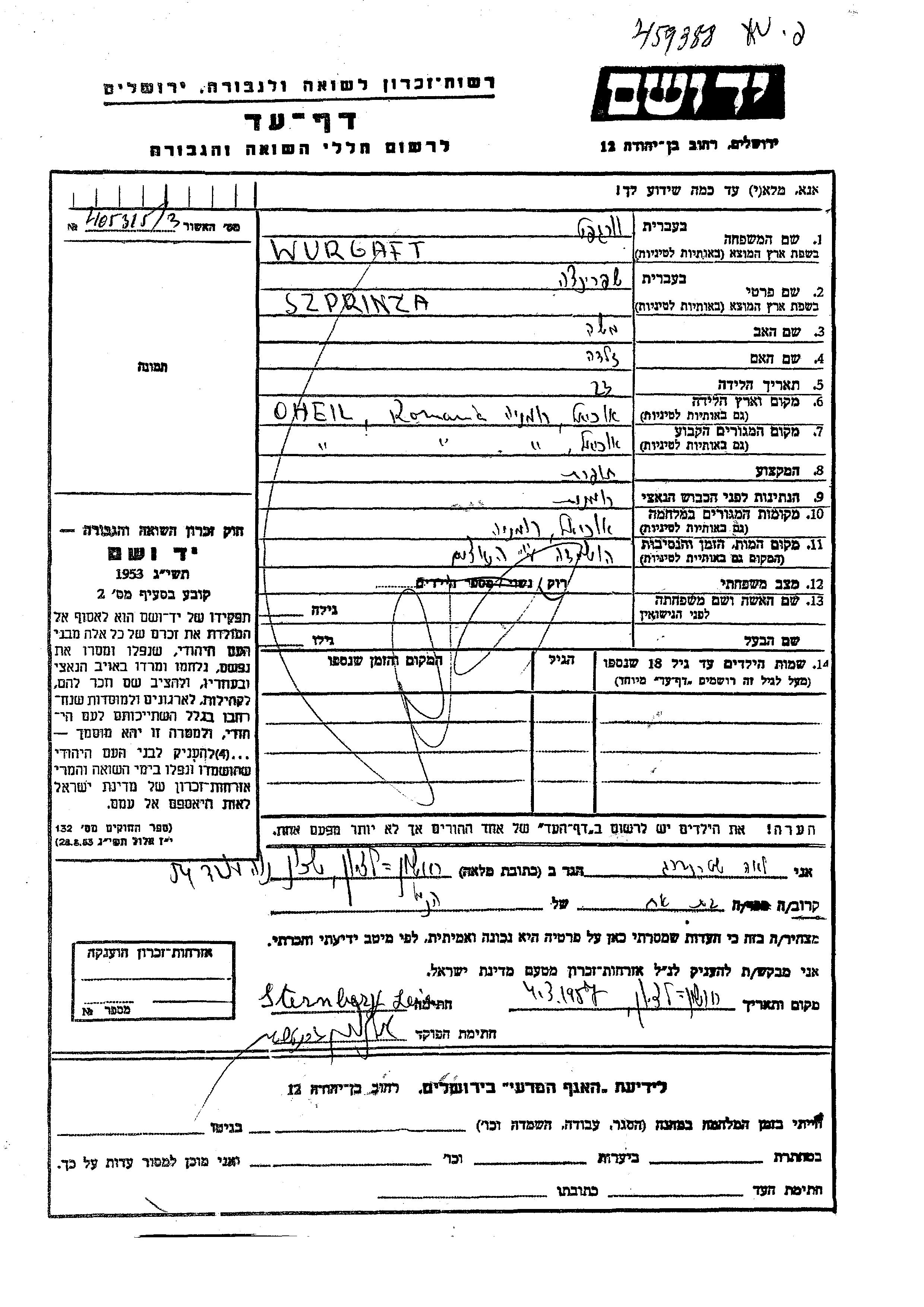Wurgaft Sprince 1921 Orgev, Roumanie Feuille de témoignage
