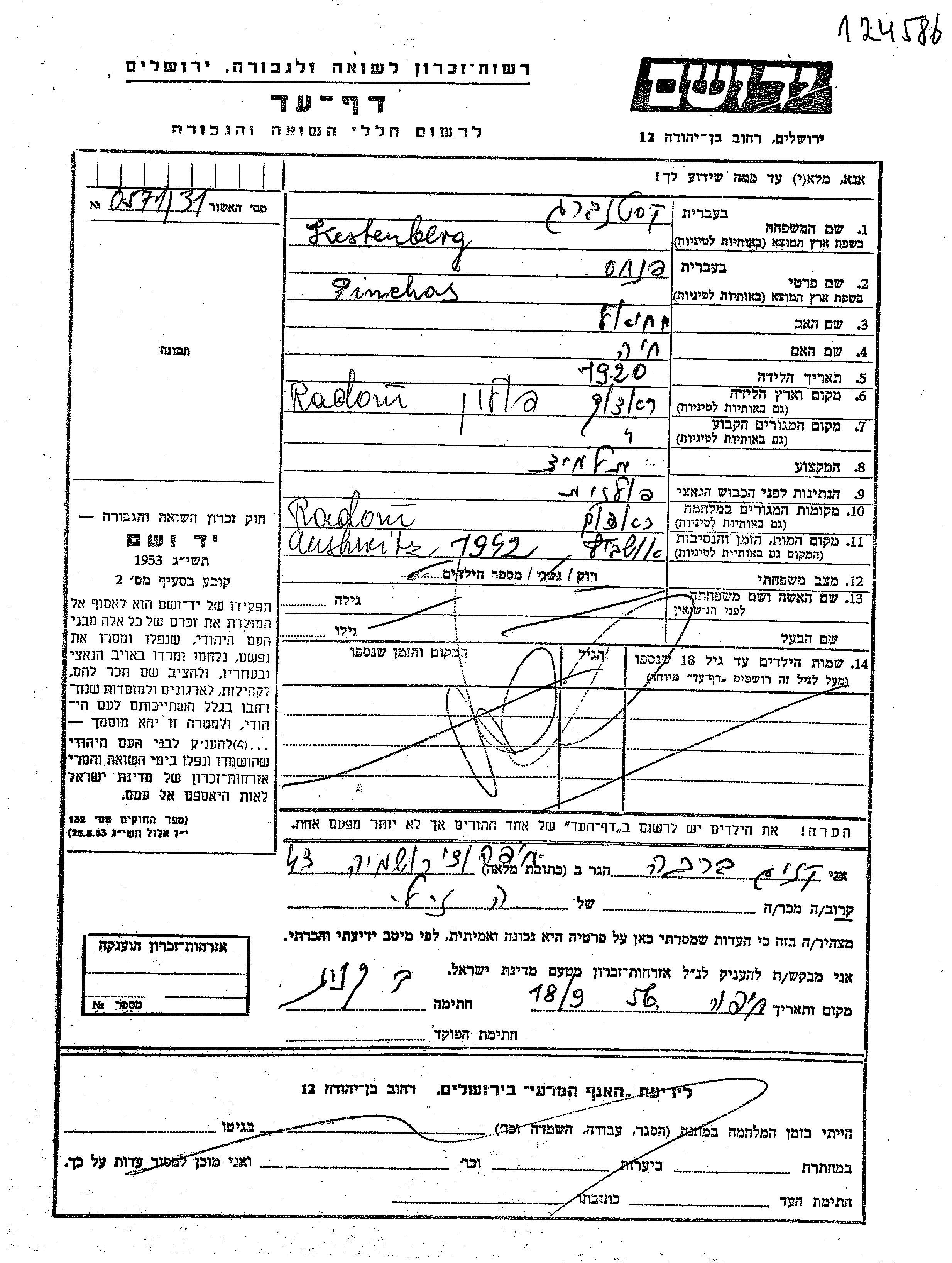 Kestenberg Pinchas 1920 Radom, Pologne Feuille de témoignage