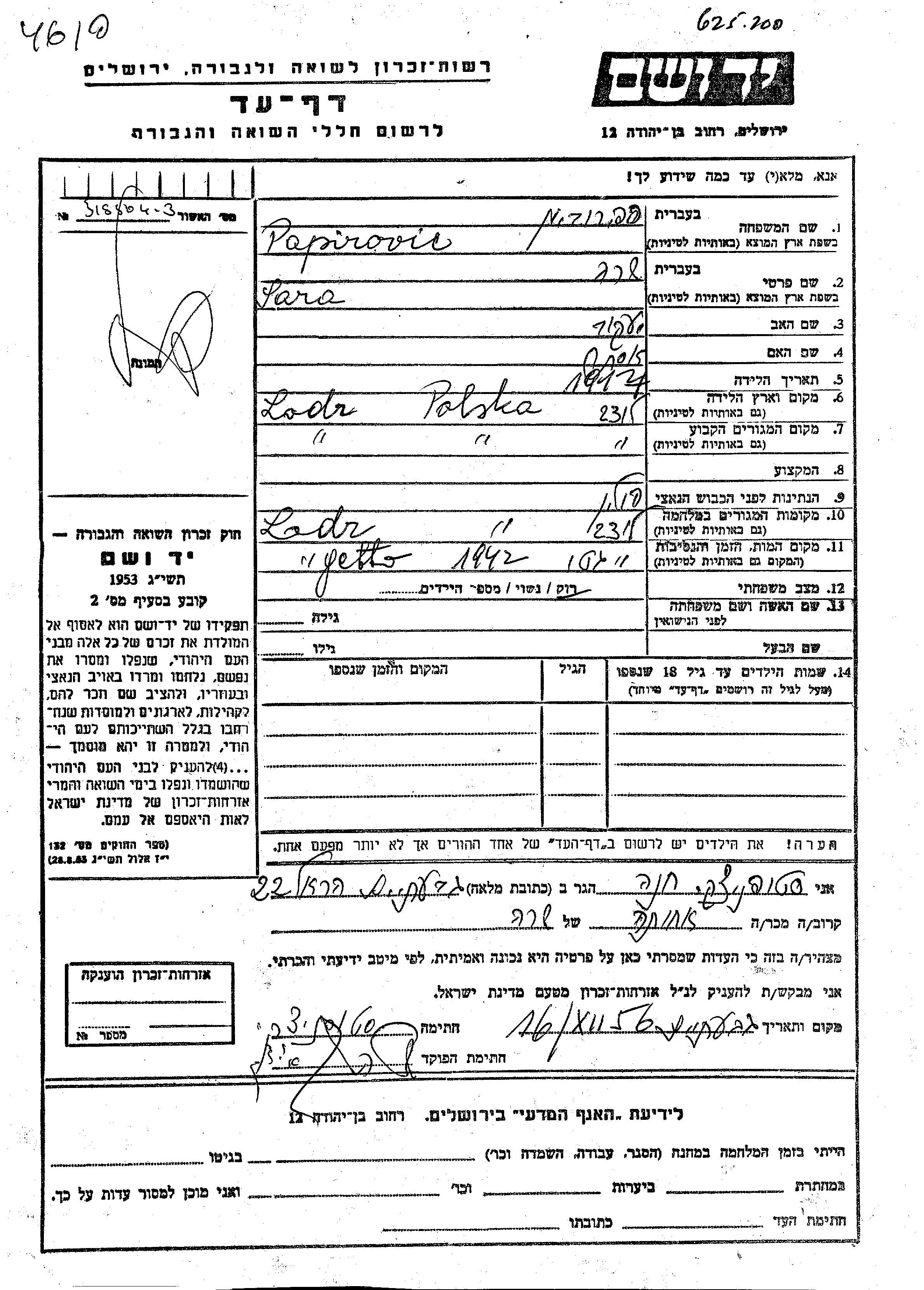 Papirovic | Sara | 1917 | Lodz, Pologne | Feuille de témoignage |