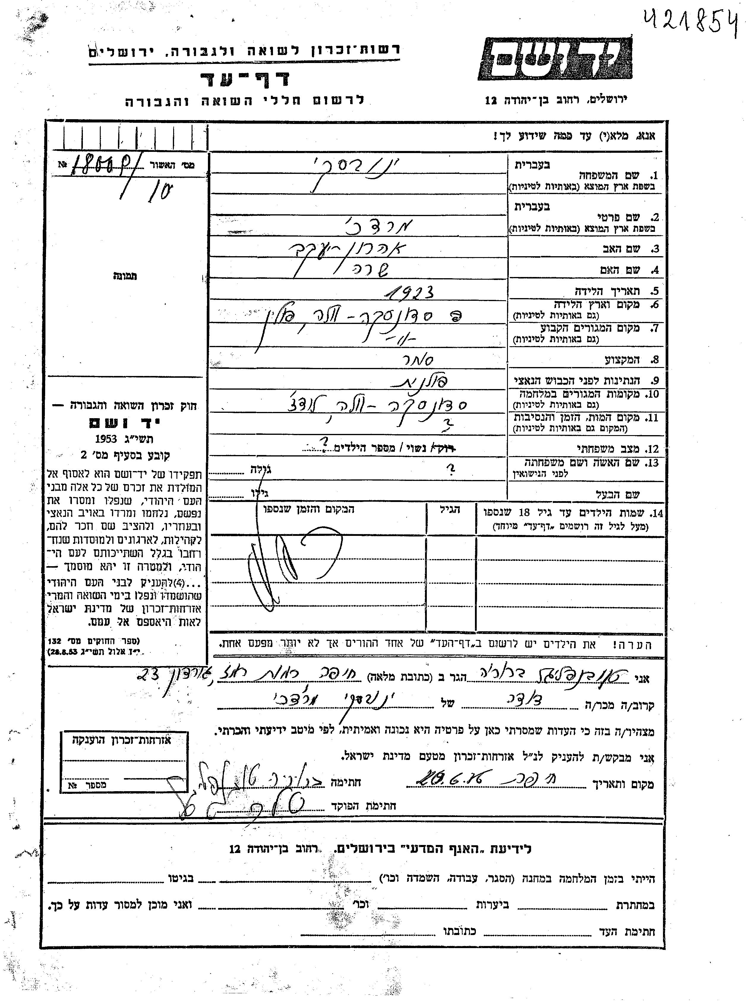 Ianovski | Mordekhai | 1923 | Sdunska Wola, Pologne | Feuille de témoignage |