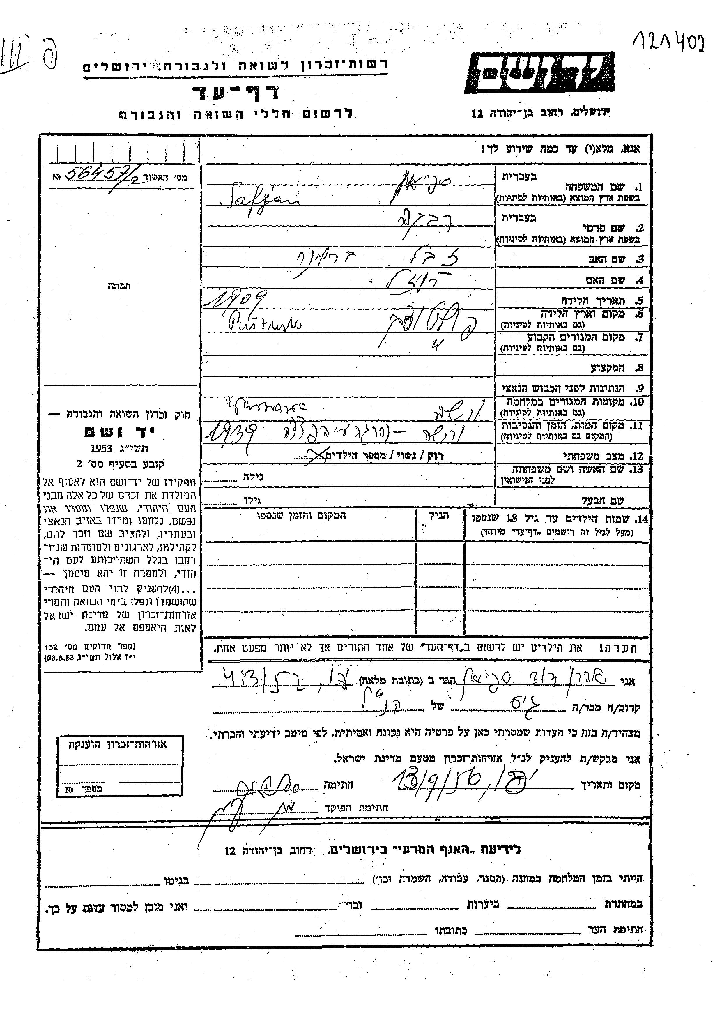 Safjan Rivka 1909 Pultusk, Pologne Feuille de témoignage