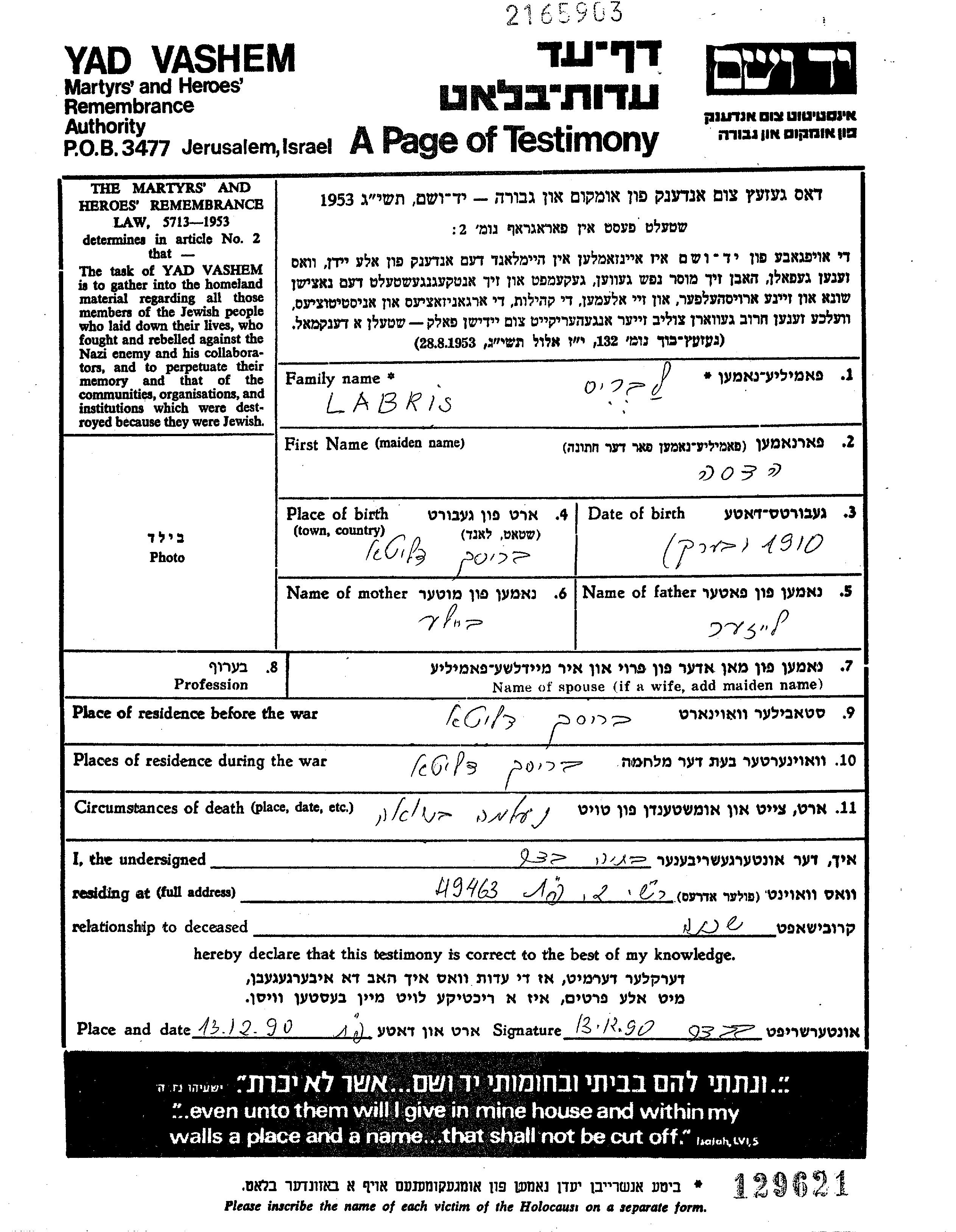 Labris | Hadasa | 1910 | Brześć nad Bugiem, Pologne | Feuille de témoignage |