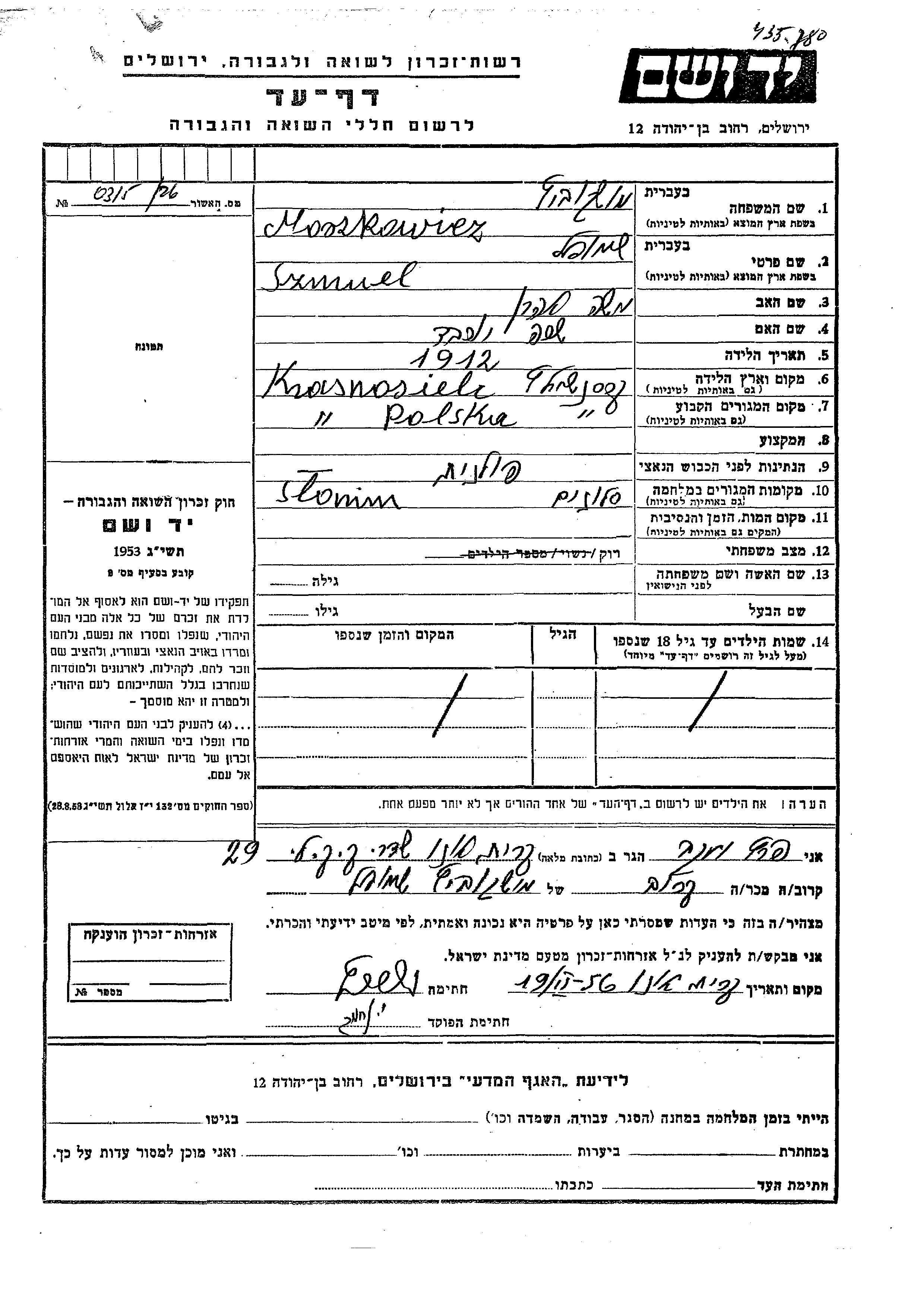 Moszkowicz Schmuel 1919 Krasnosielc, Pologne Feuille de témoignage