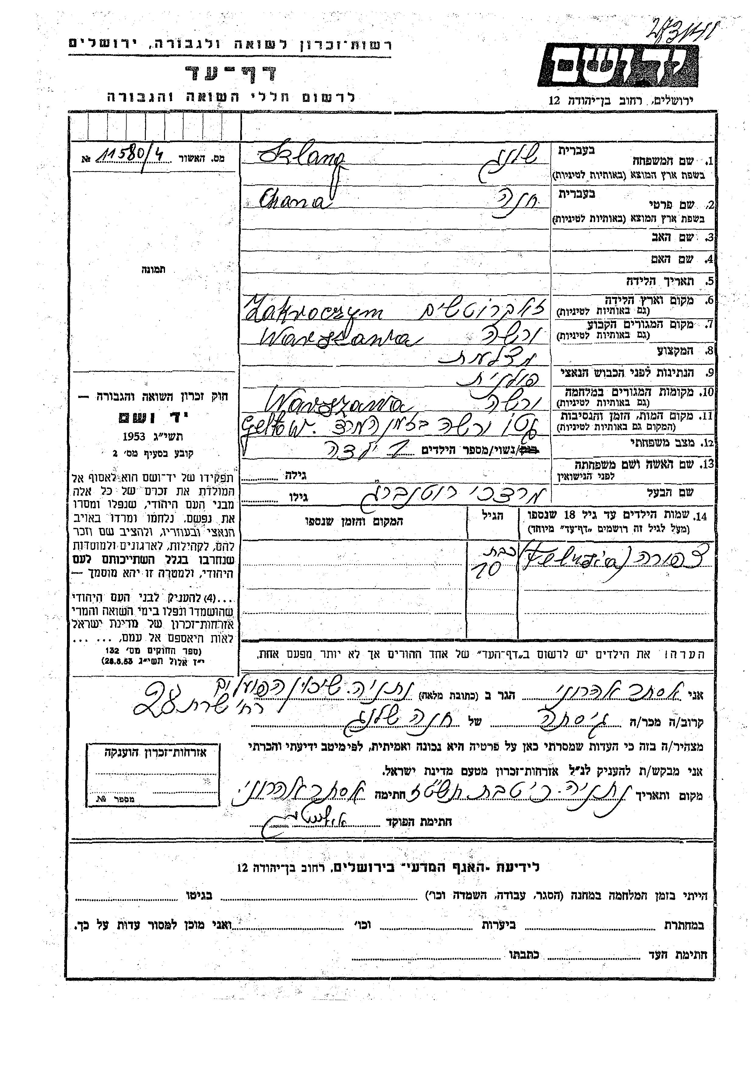 Szlang Felusia Tzipora Warszawa, Pologne Feuille de témoignage