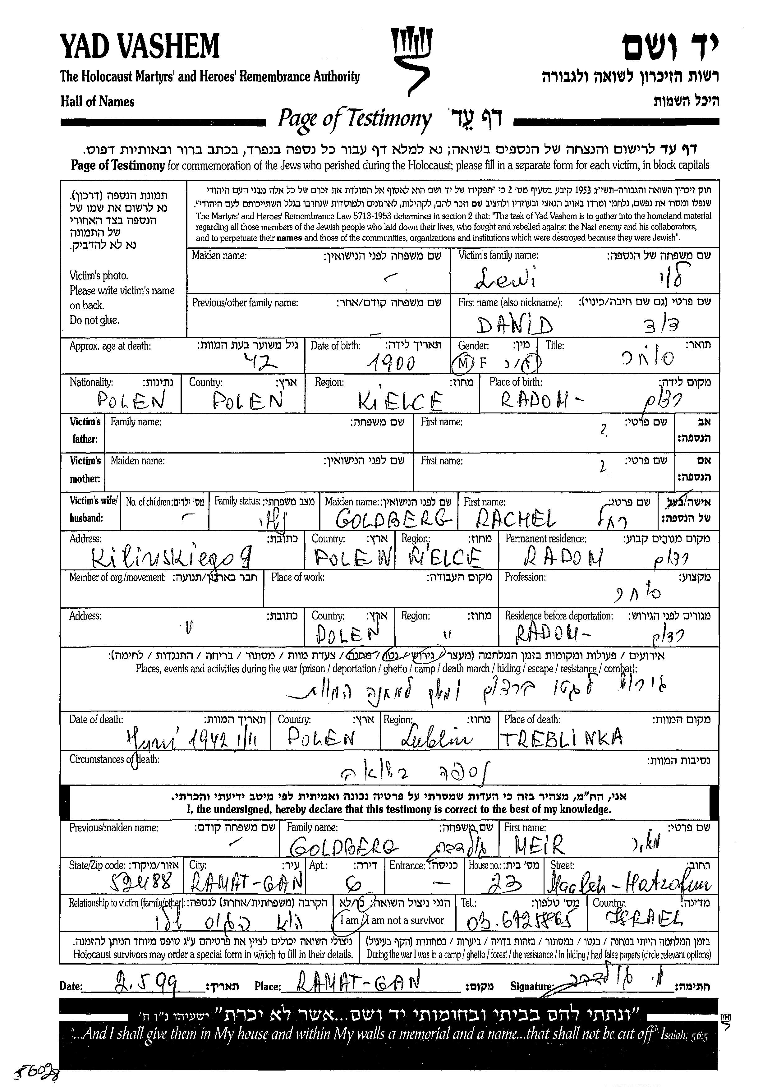 Lewi Dawid 1906 Radom, Pologne Feuille de témoignage