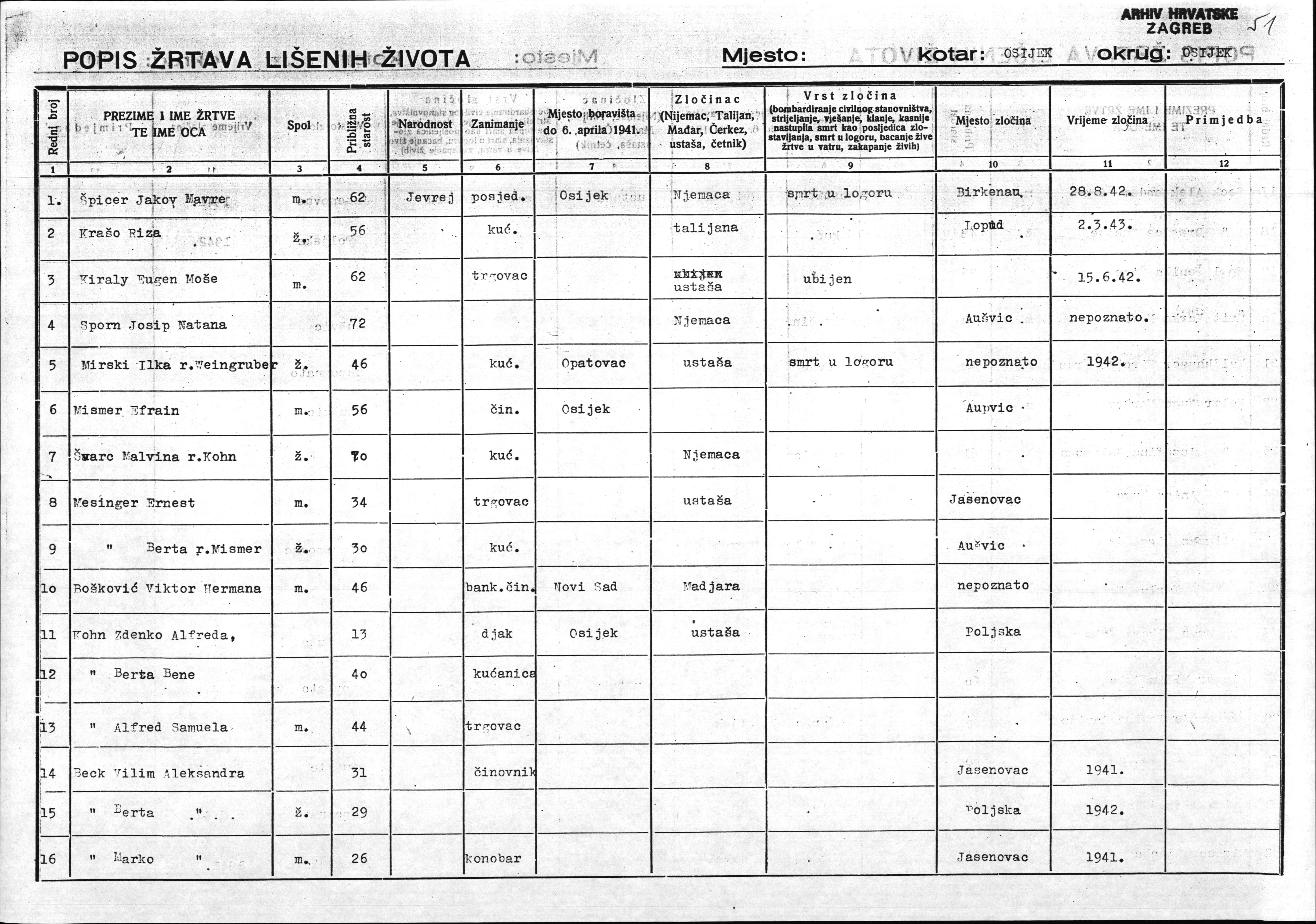 | Švarc | Malvina | Osijek, Yugoslavie | Liste de personnes persécutées | |