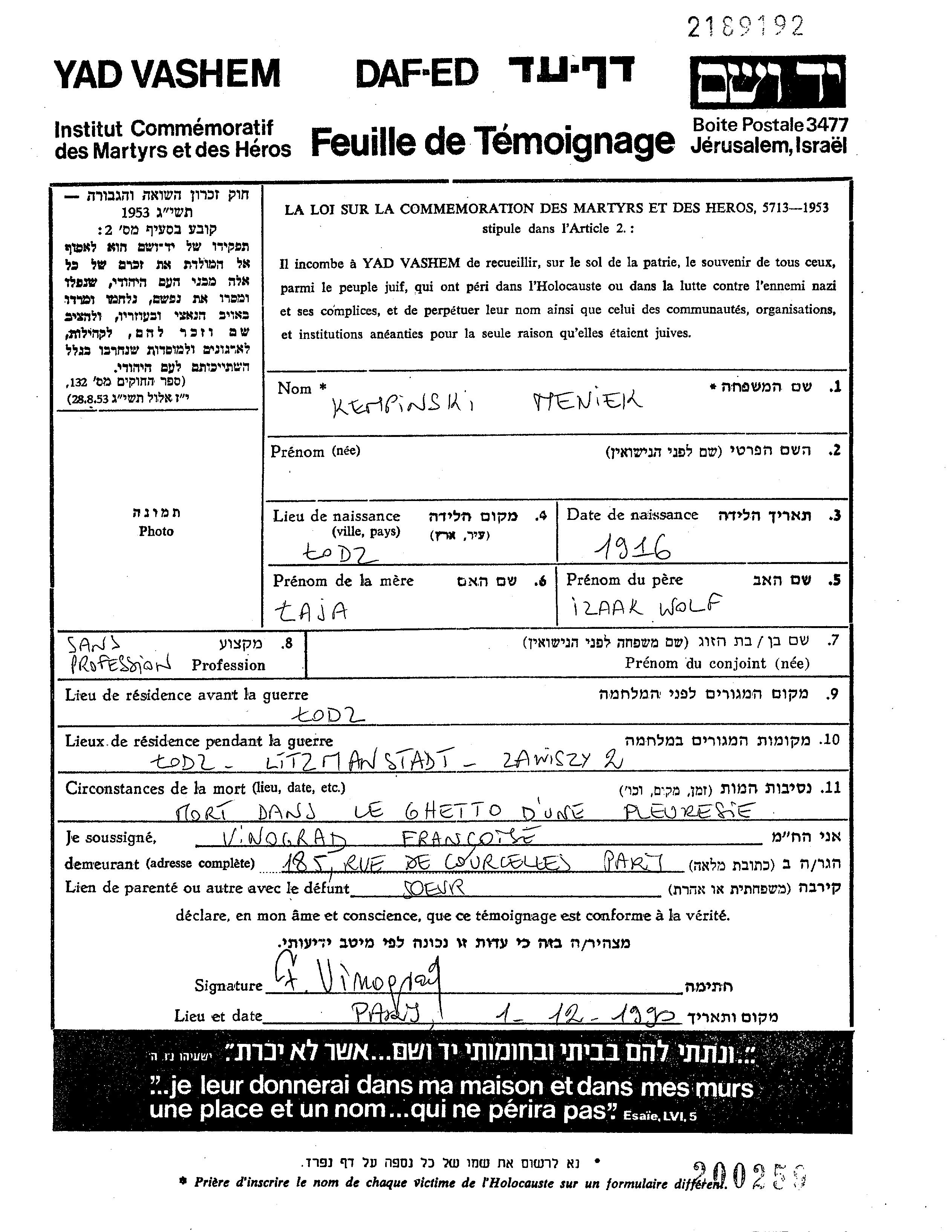 Kempinski Meniek 1916 Lodz, Pologne Feuille de témoignage