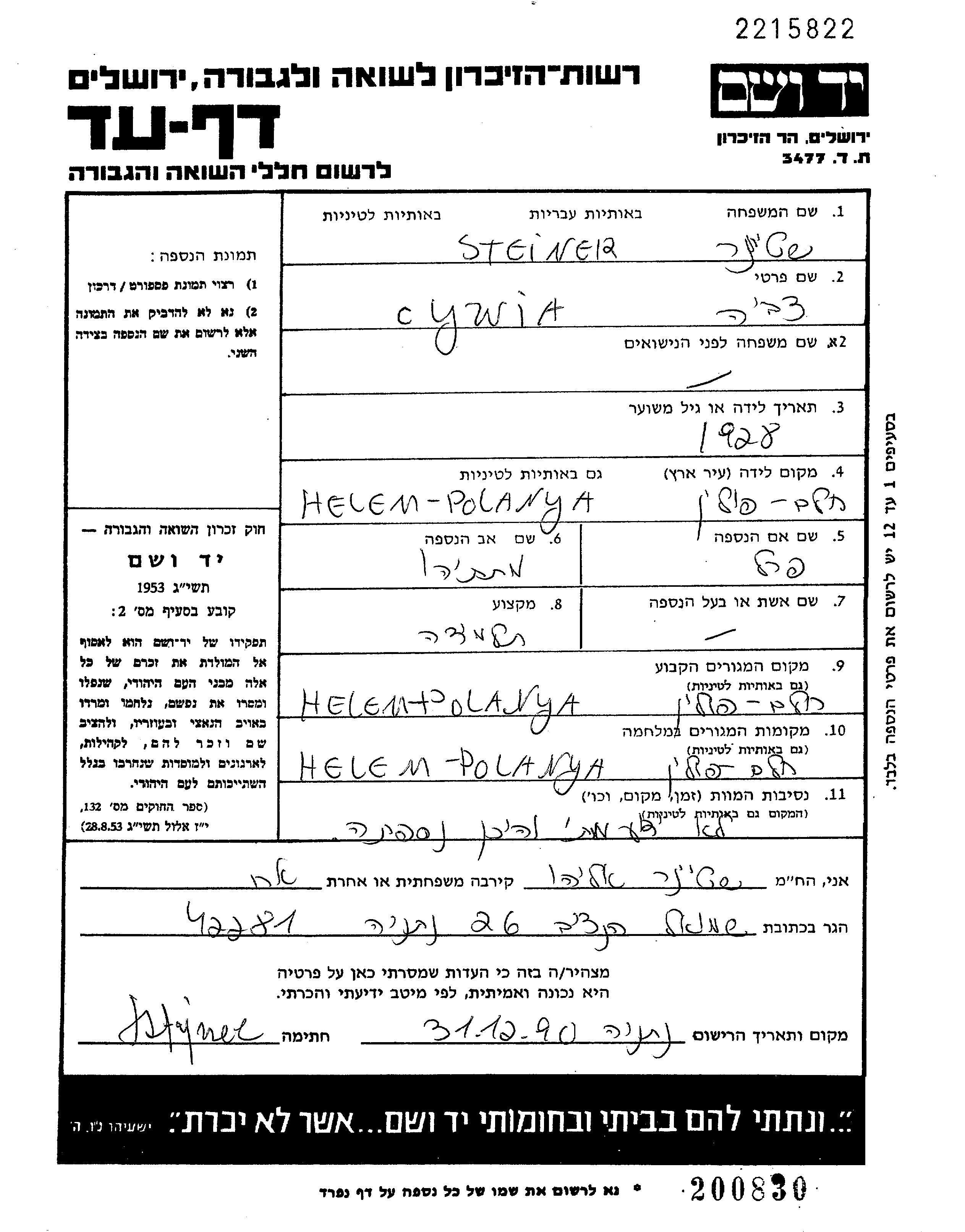 Steiner Cywia Chelem, Pologne Feuille de témoignage