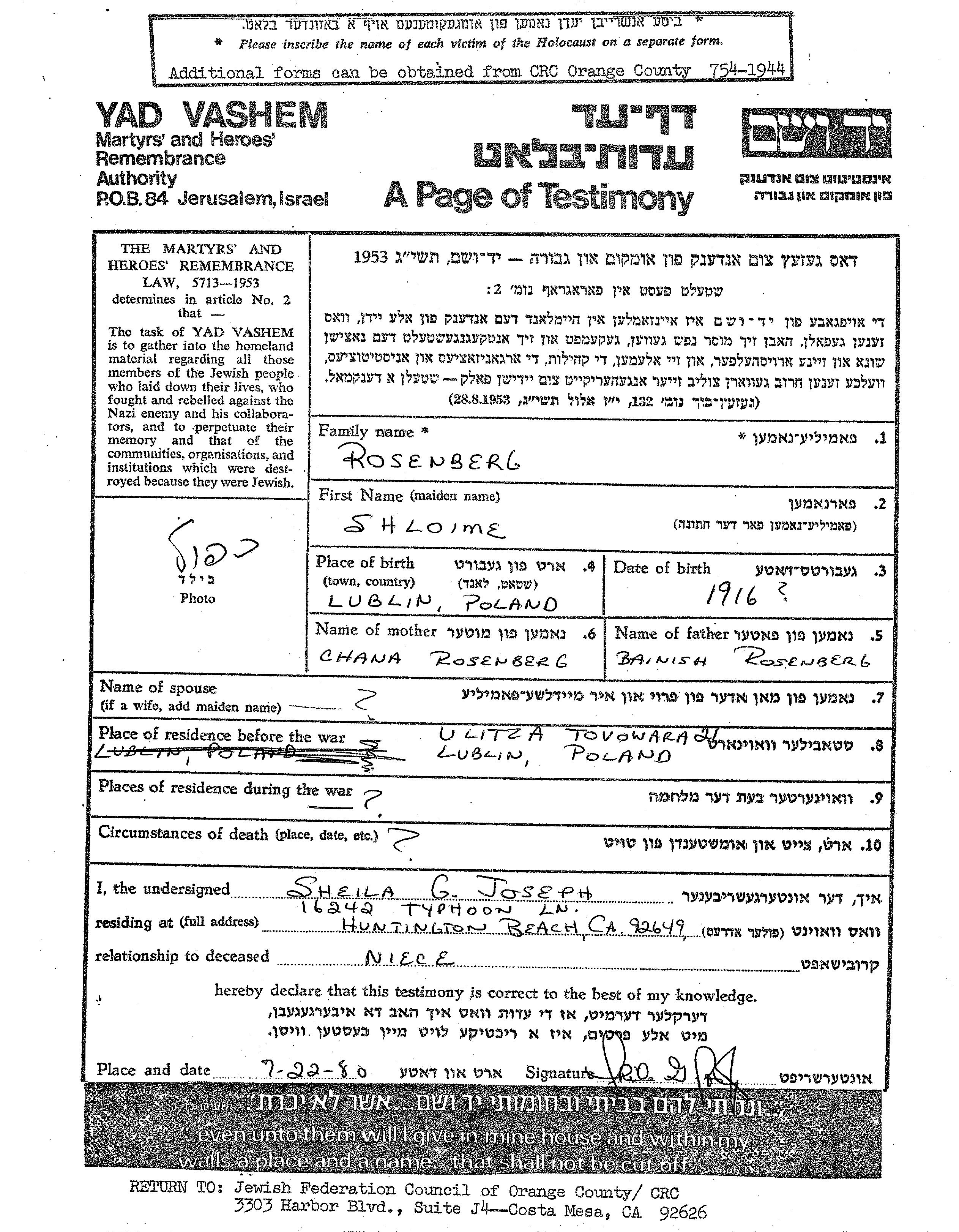 Rosenberg | Shloime | Lublin, Pologne | Feuille de témoignage |