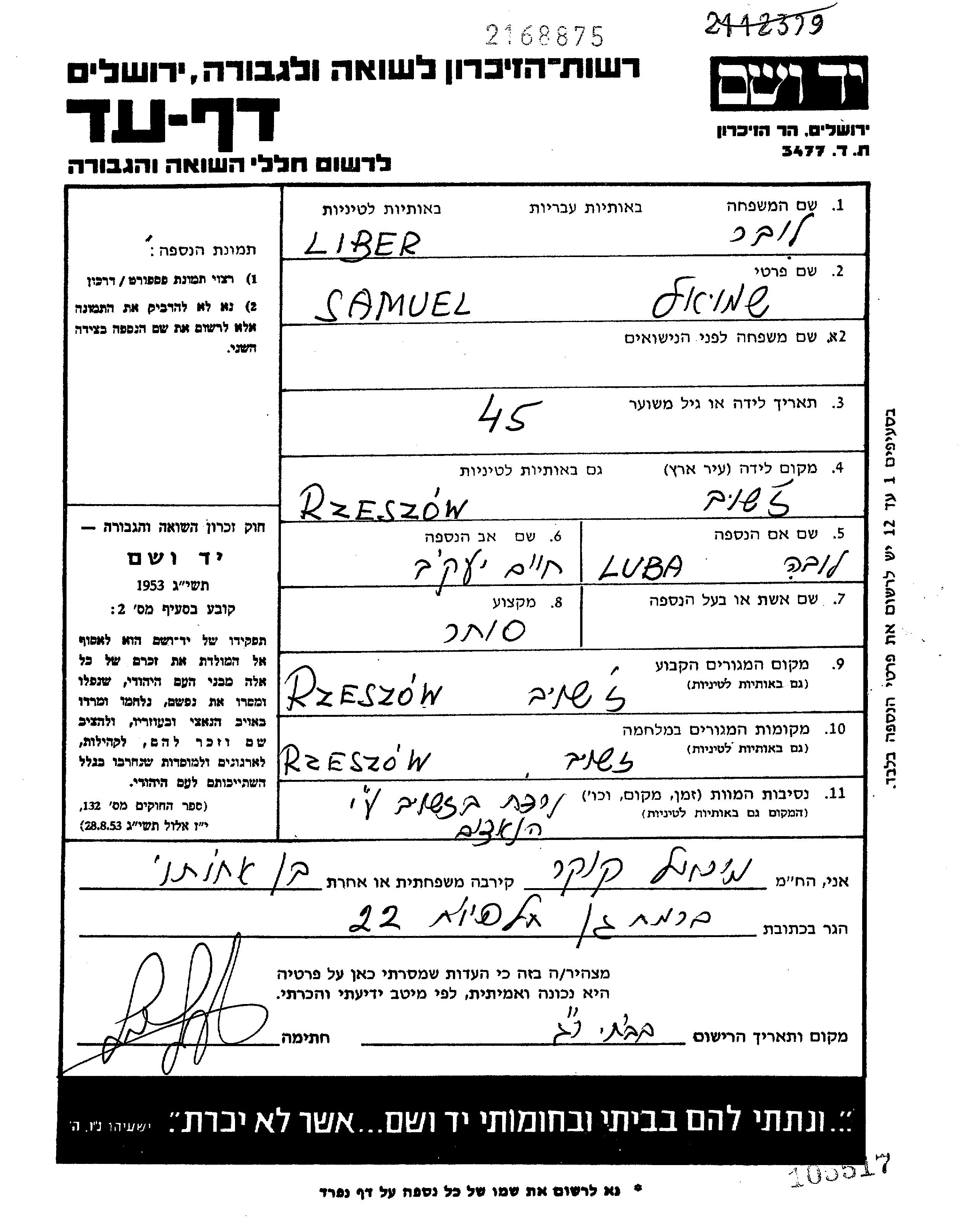 | Liber | Shmuel | Rzeszow, Pologne | Feuille de témoignage |