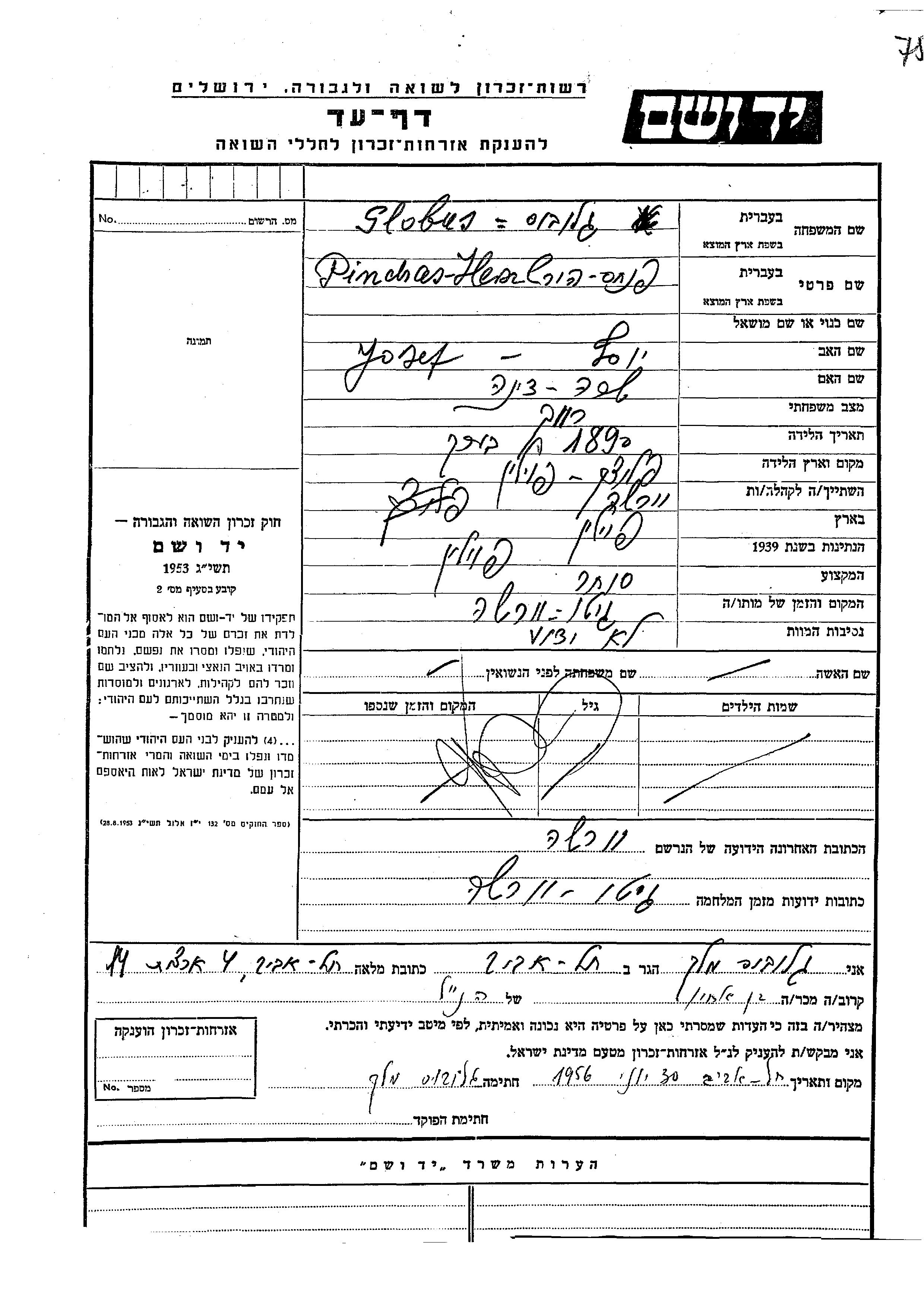 Hirsh Pinkhas Globus est né à Plock, Pologne. Avant la seconde guerre mondiale il vivait à Plock, Pologne.
