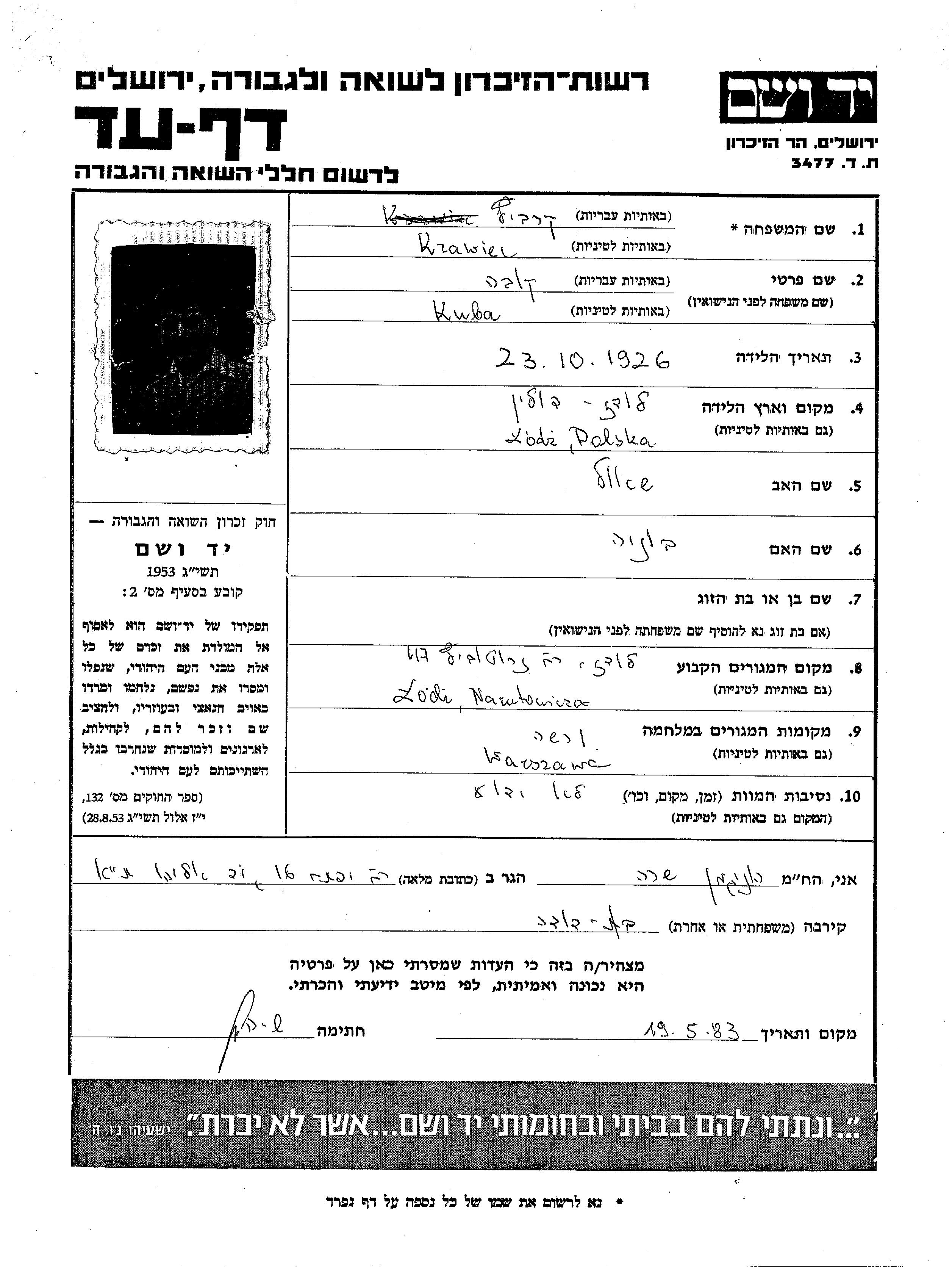 Krawiec Kuba 1926 Lodz, Pologne Feuille de témoignage
