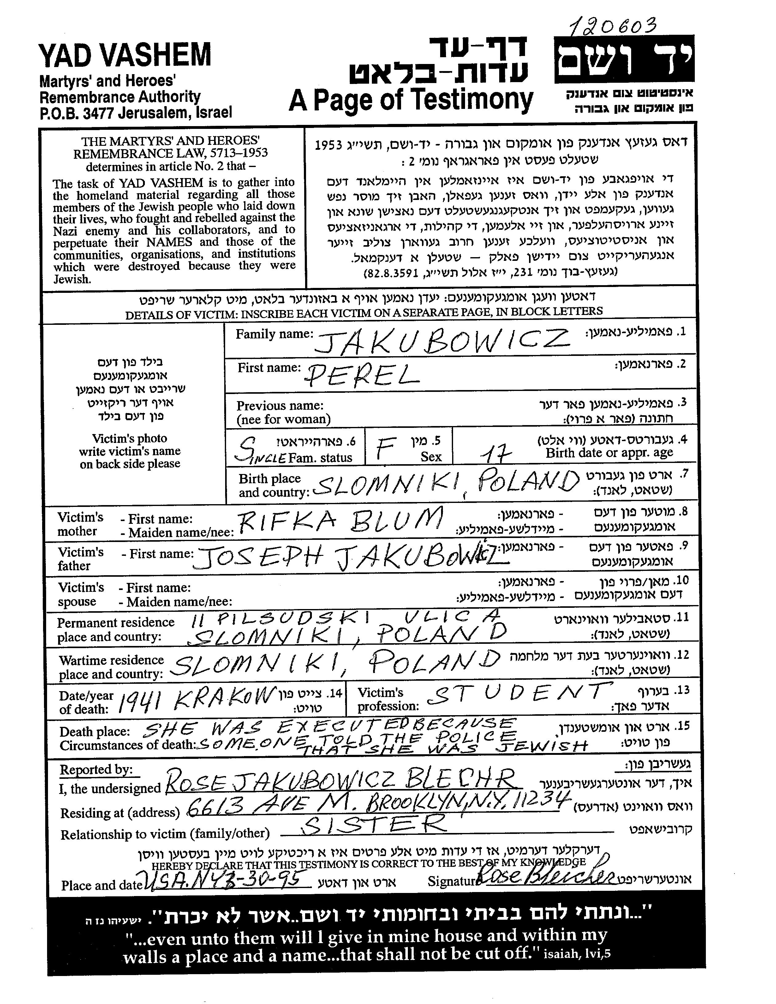 Jakubowicz | Perel | Slomniki, Pologne | Feuille de témoignage | |