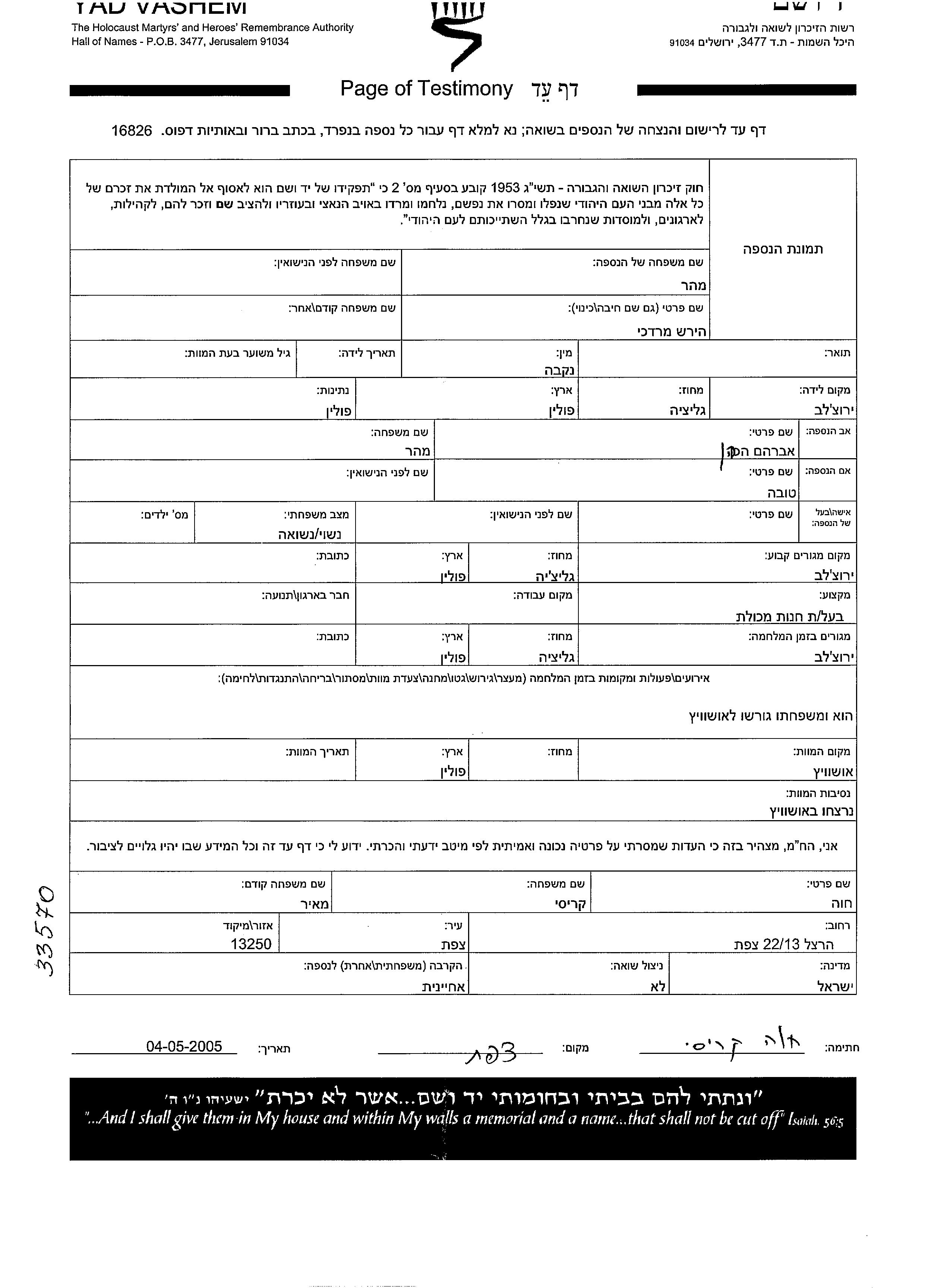 Meher Hirsh Mordekhai endroit inconnu, Feuille de témoignage (digitale)