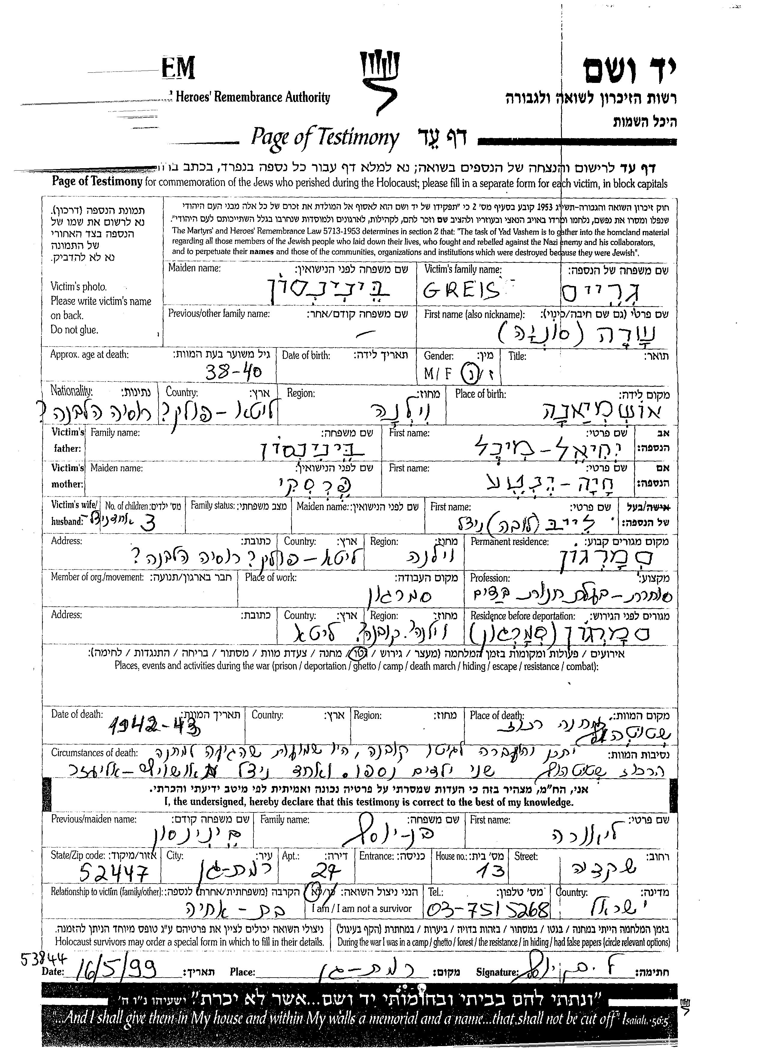Yad Vashem - Pages of Testimony Names Memorial Collection