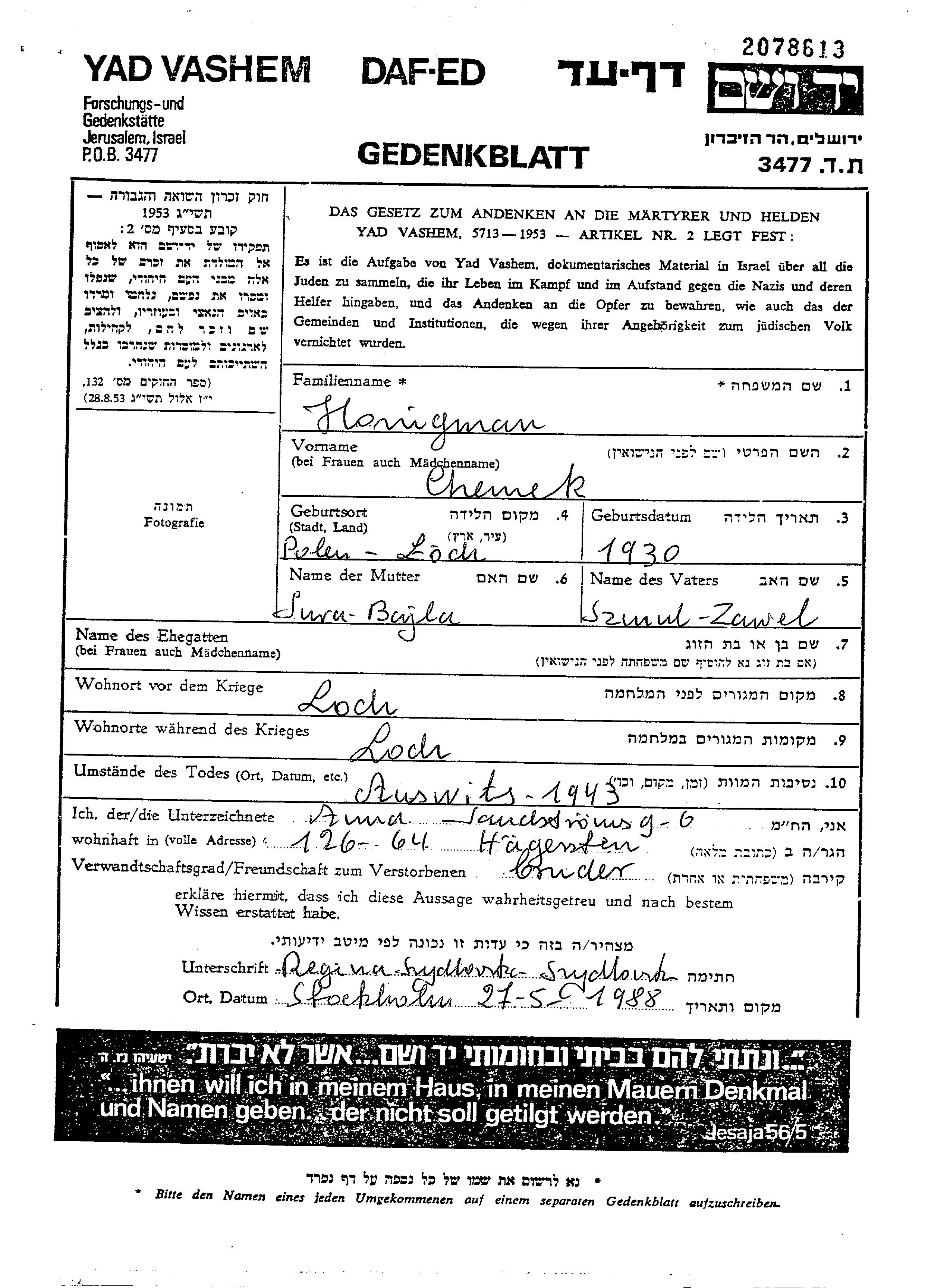 Khaim Chemek Khema Honigman est né à Lodz, Pologne. Il était Élève. Avant la seconde guerre mondiale il vivait à Lodz, Pologne.