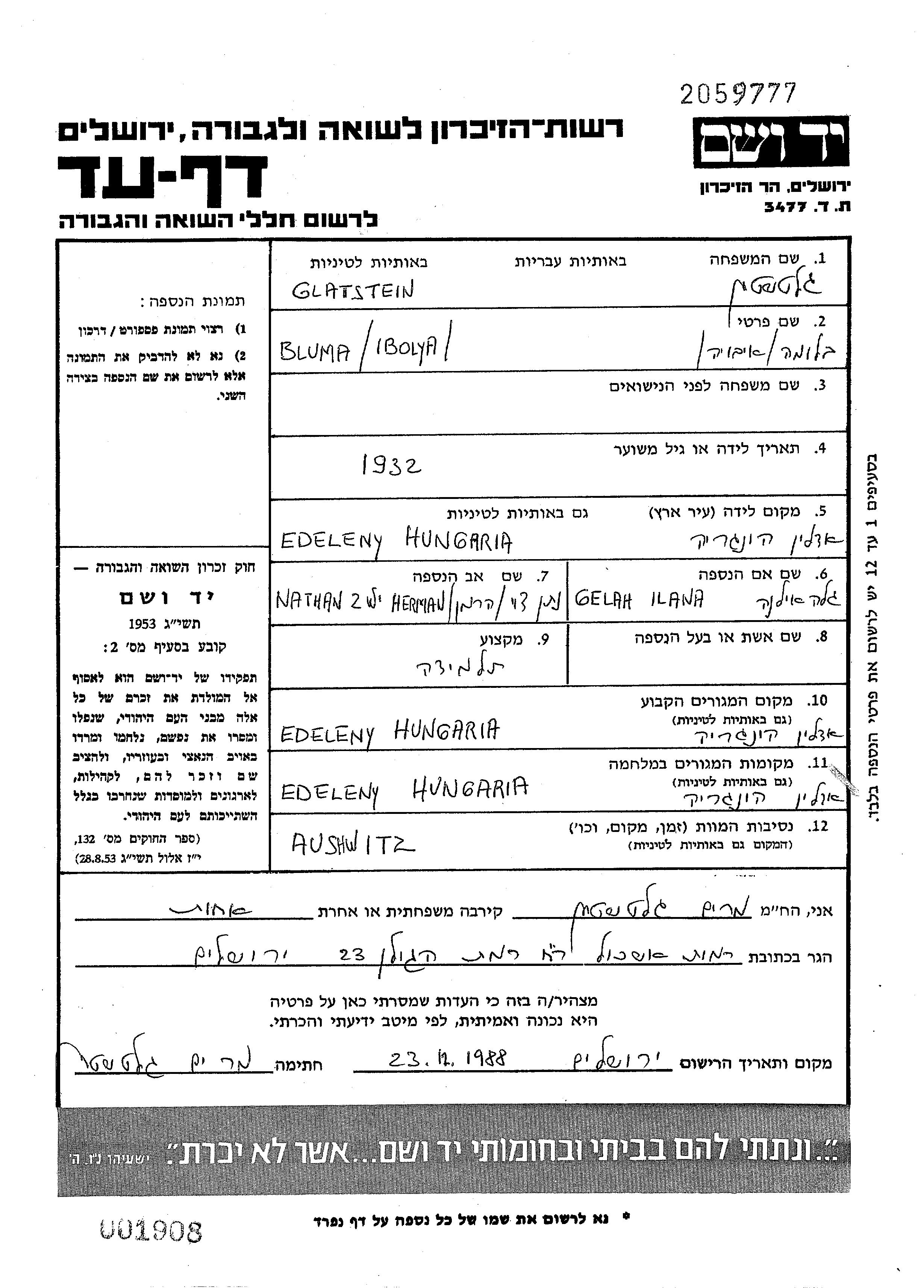 Glatstein Ibolya Bluma 1932 Edeleny, Hongrie Feuille de témoignage