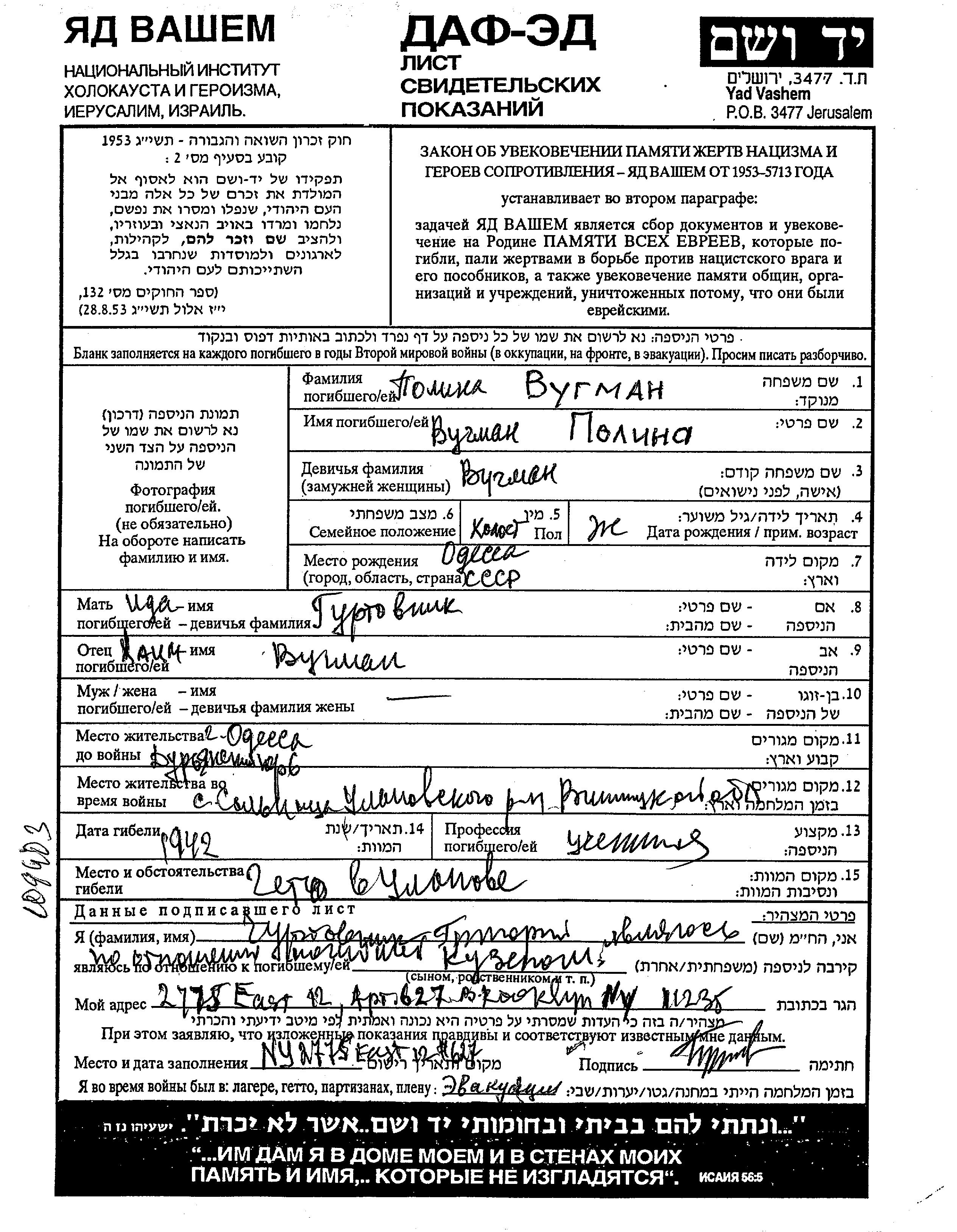Vugman Polina Odessa, Ukraine (URSS) Feuille de témoignage