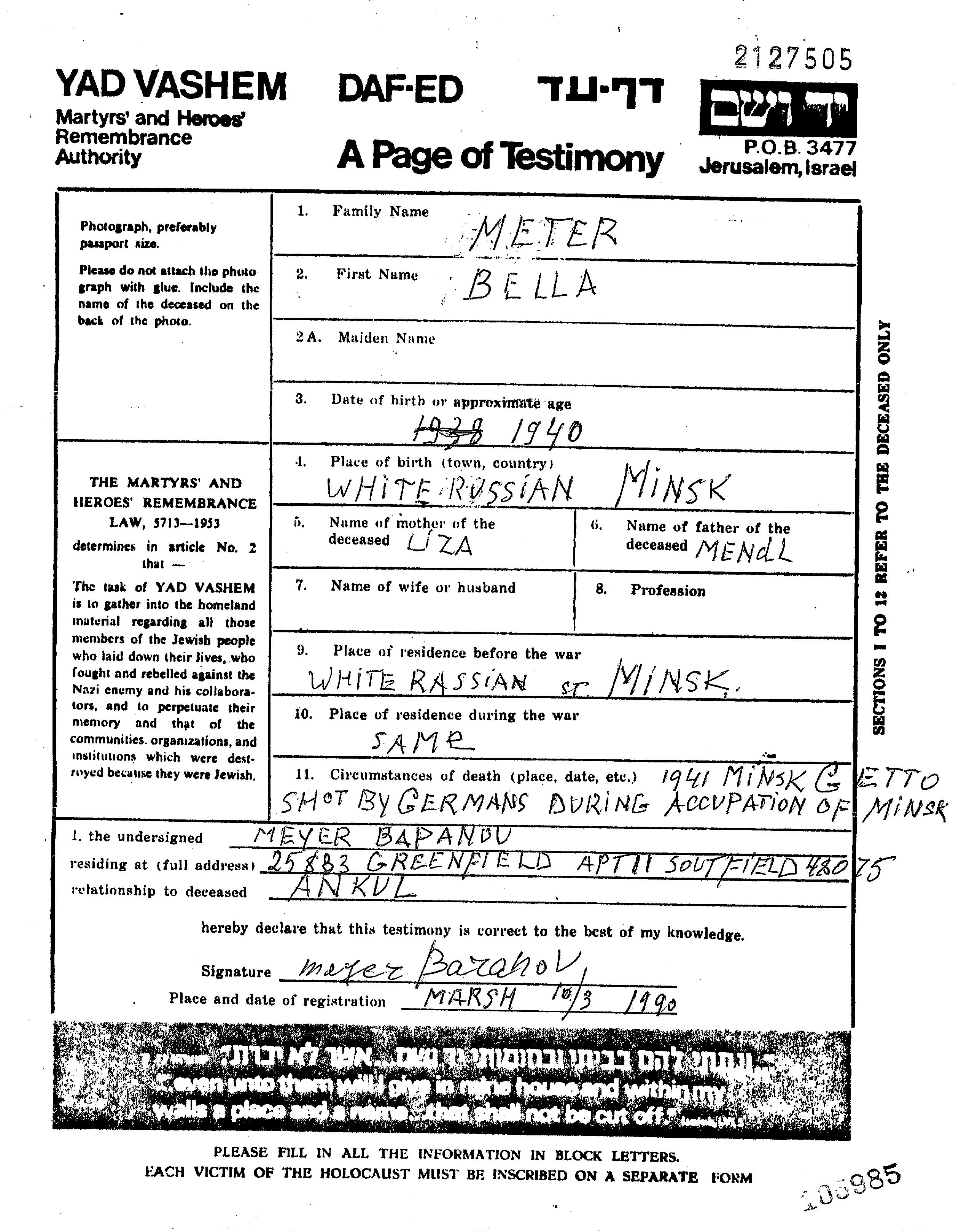Bela Meter est née à Minsk, Bélorussie (URSS) en 1938. Avant la seconde guerre mondiale elle vivait à Minsk, Bélorussie (URSS).