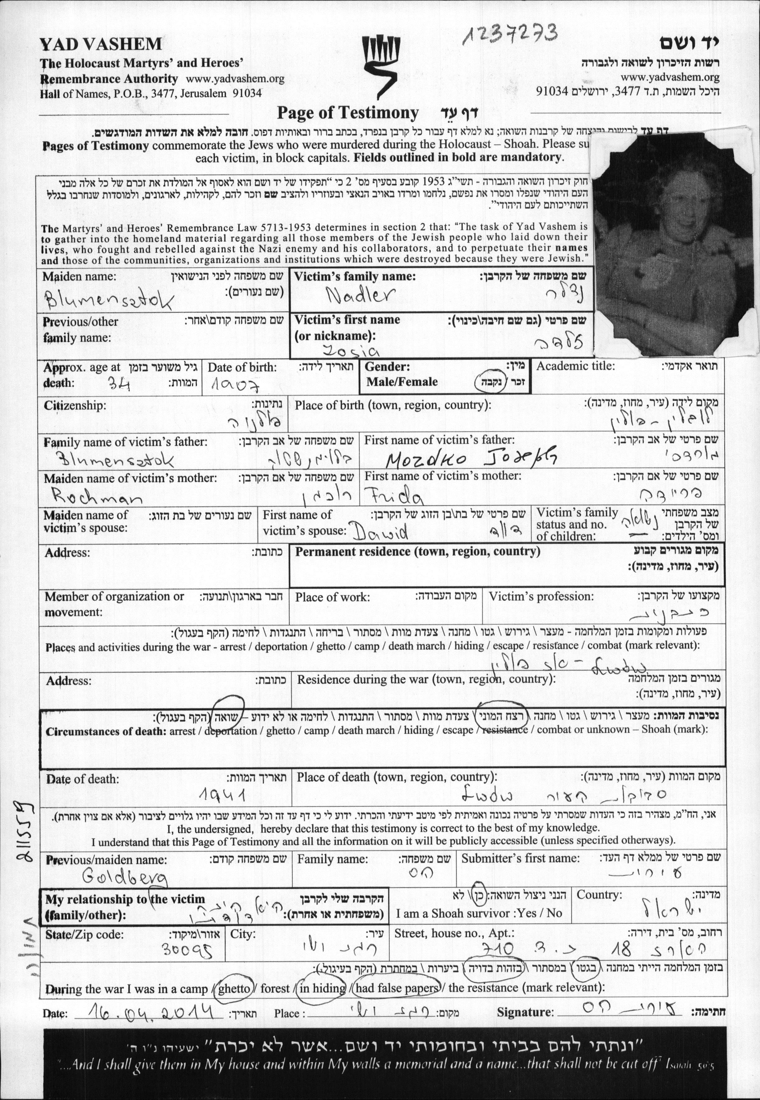 | Nadler | Blima Zelda | 1904 | Lublin, Pologne | Feuille de témoignage |