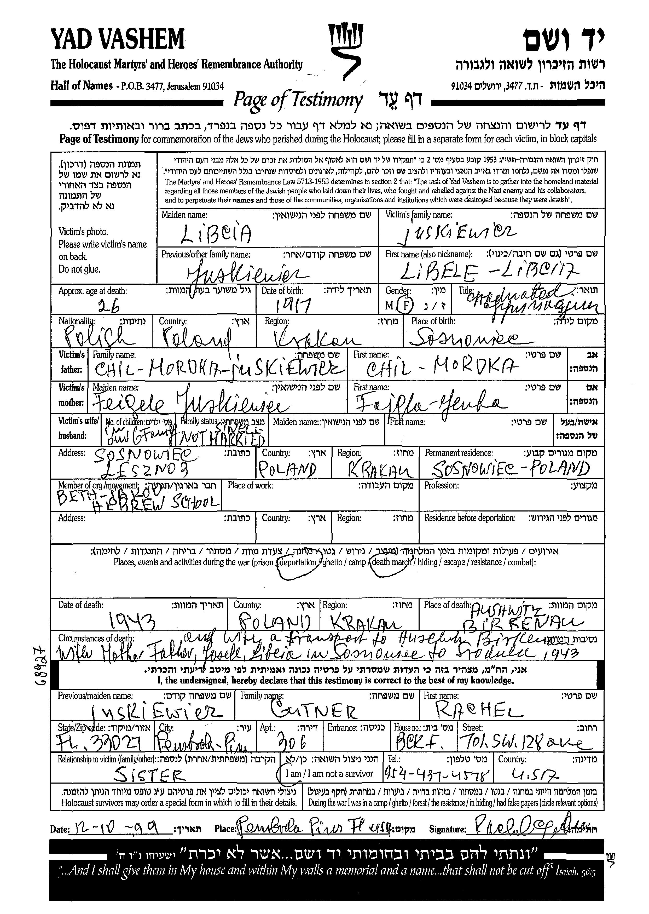 Liba Ahuva Juskiewicz est née à Sosnowiec, Pologne en 1916. Avant la seconde guerre mondiale elle vivait à Sosnowiec, Pologne.