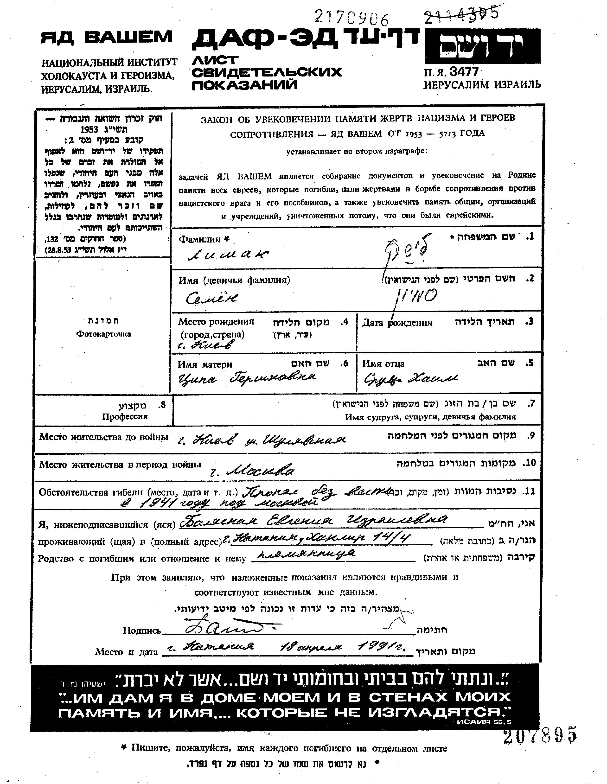 Lishak Semyon 1909 Kiev, Ukraine (URSS) Feuille de témoignage
