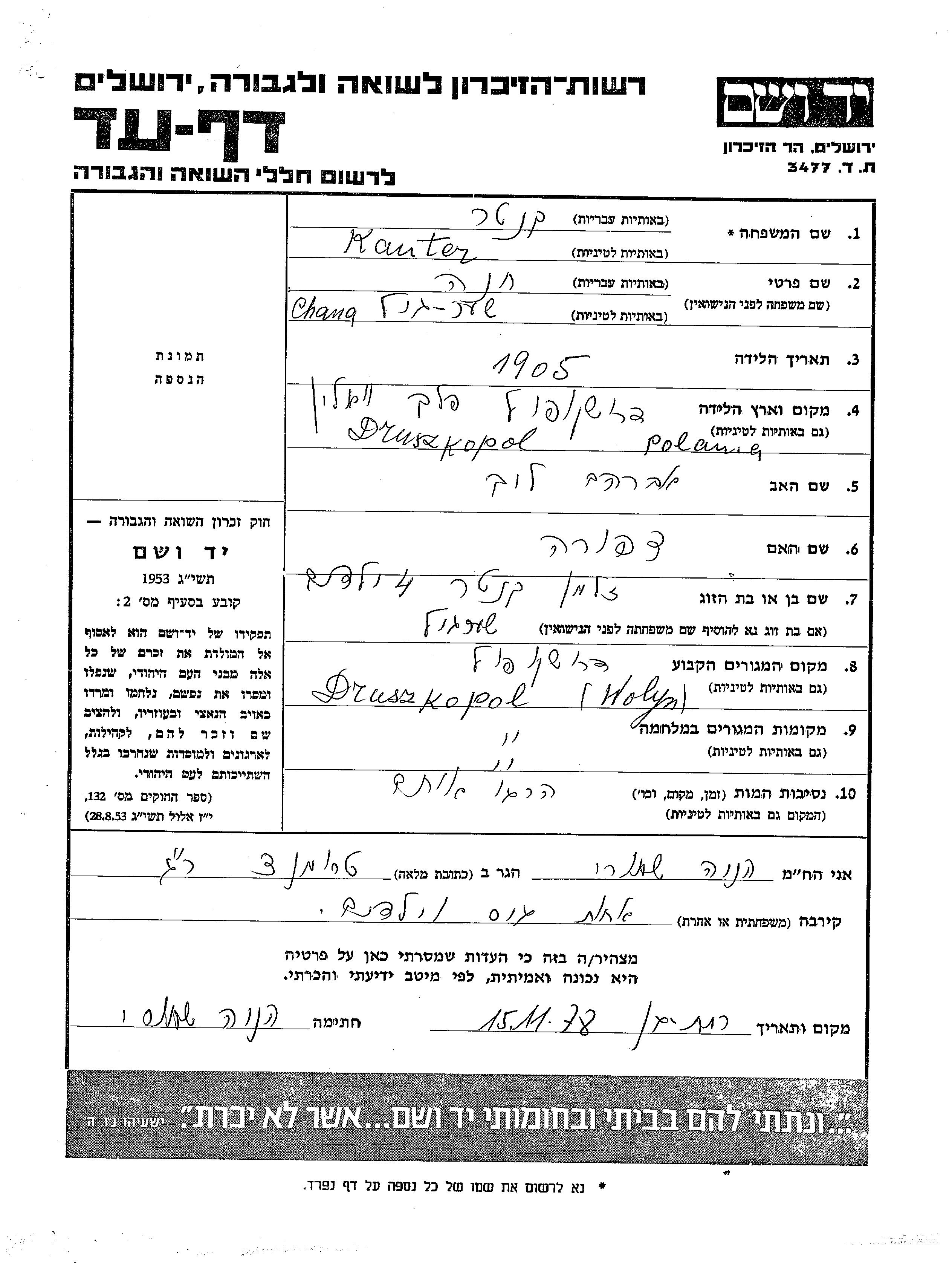 Kanter | Chana | 1905 | Druszkopol, Pologne | Feuille de témoignage |