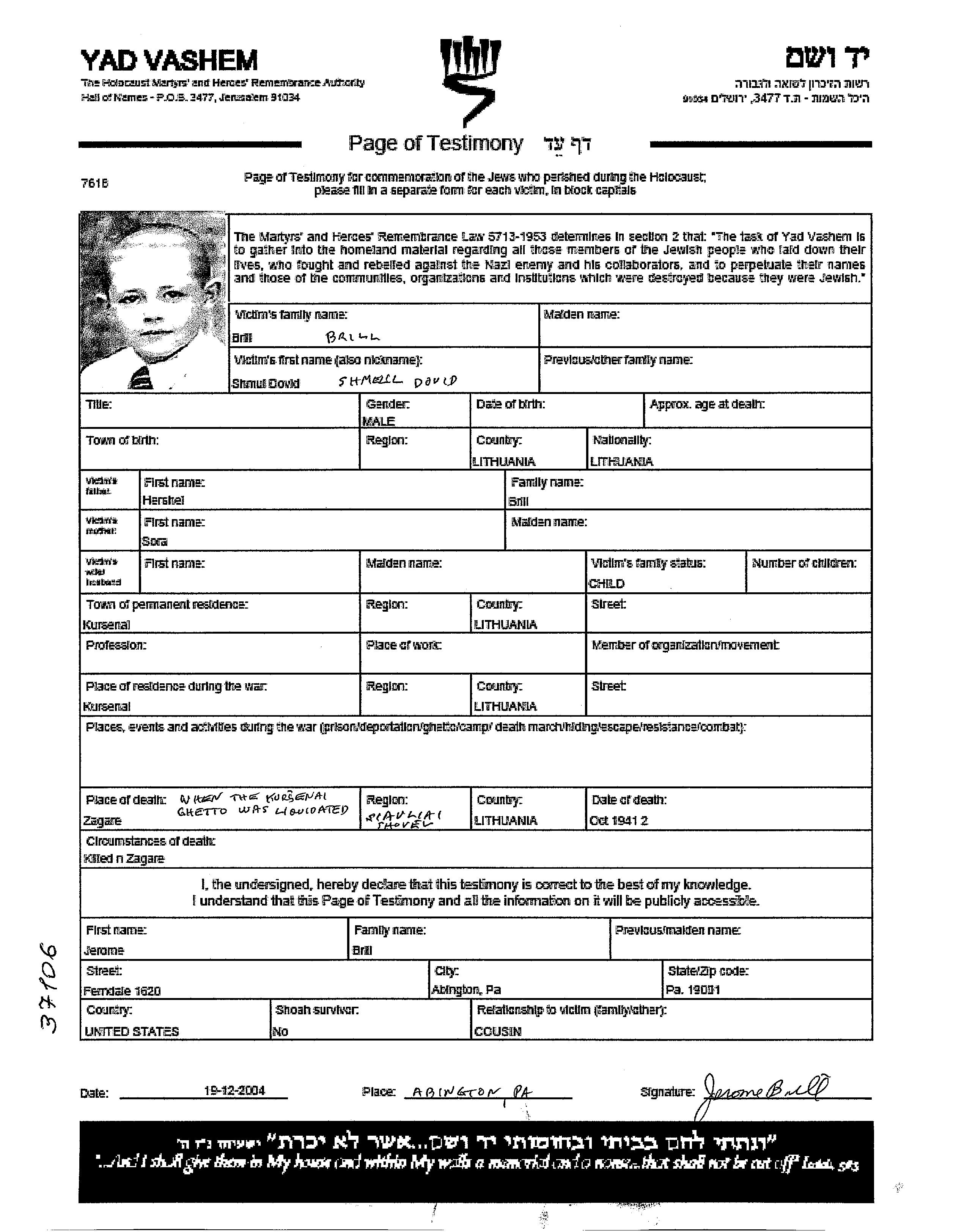 Brill | Dovid Shmul | Kuršėnai, Lituanie | Feuille de témoignage (digitale) | |
