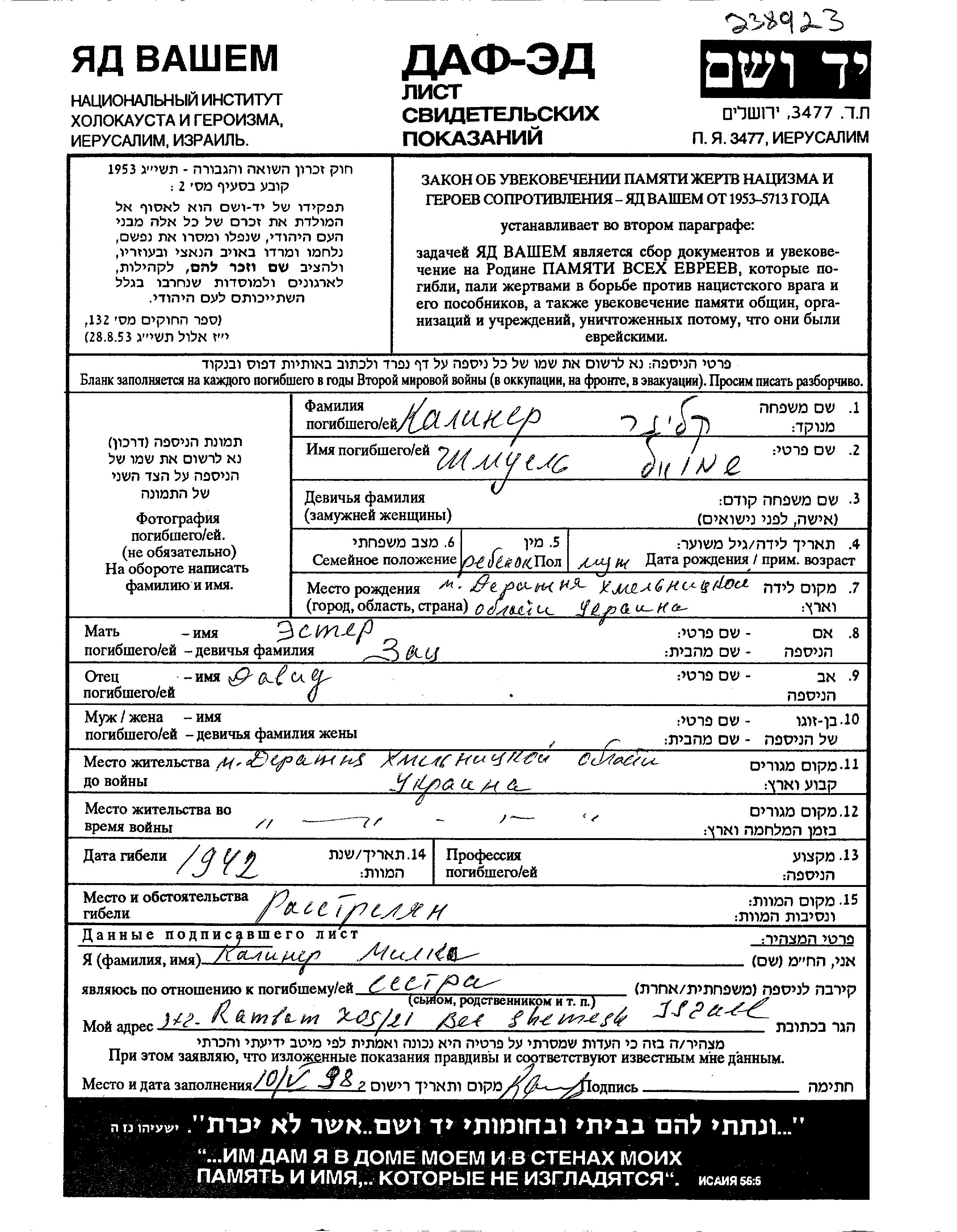 Kaliner Shmuel Derazhnya, Ukraine (URSS) Feuille de témoignage