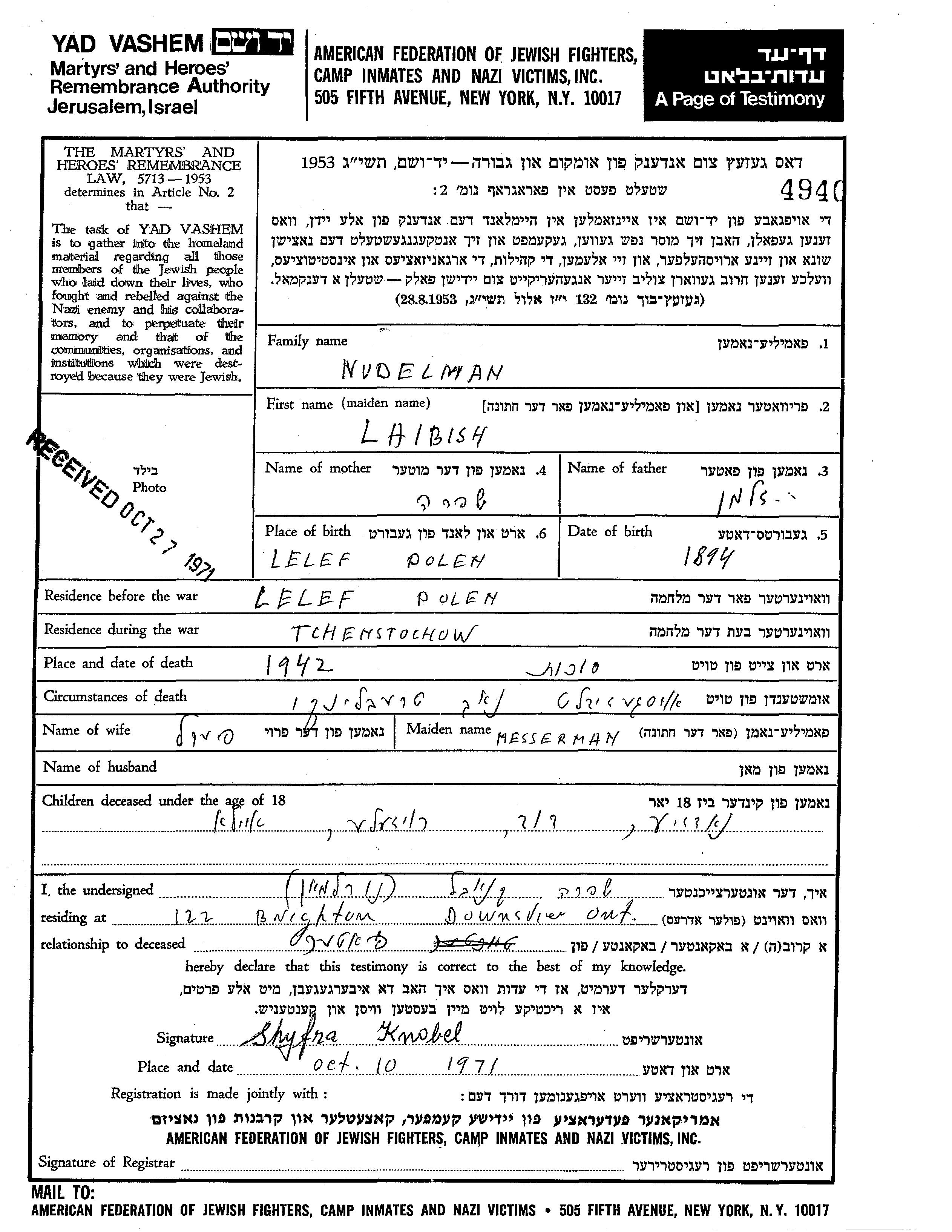 Nudelman Ayala Lelev, Pologne Feuille de témoignage