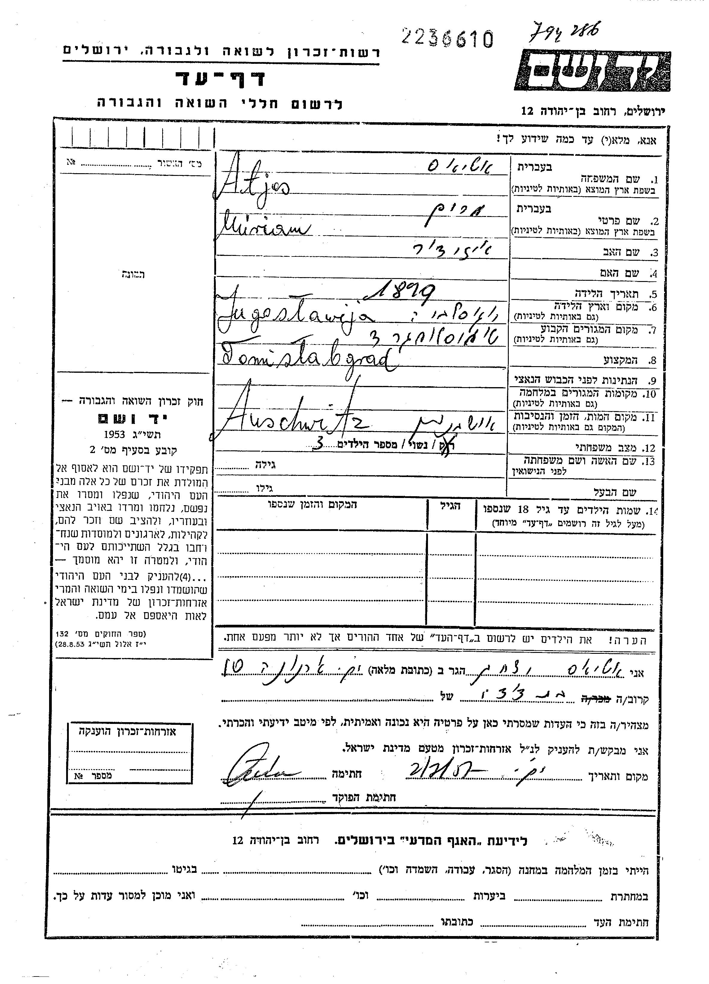 Yad Vashem - Pages of Testimony Names Memorial Collection
