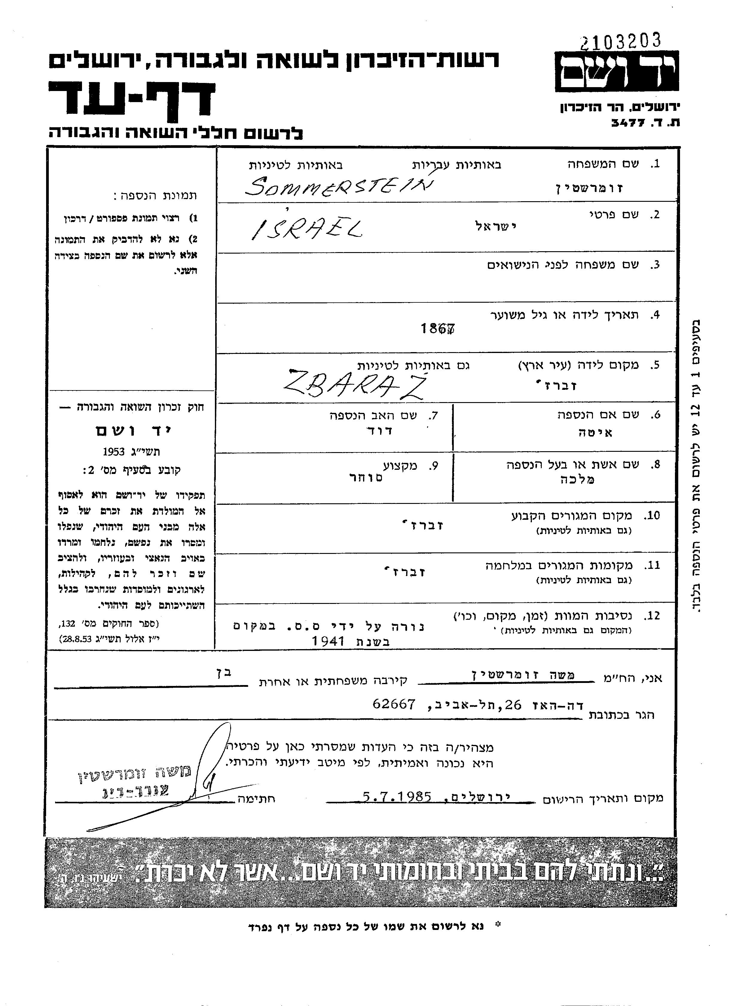 Sommerstein | Israel | 1867 | Zbaraż, Pologne | Feuille de témoignage |