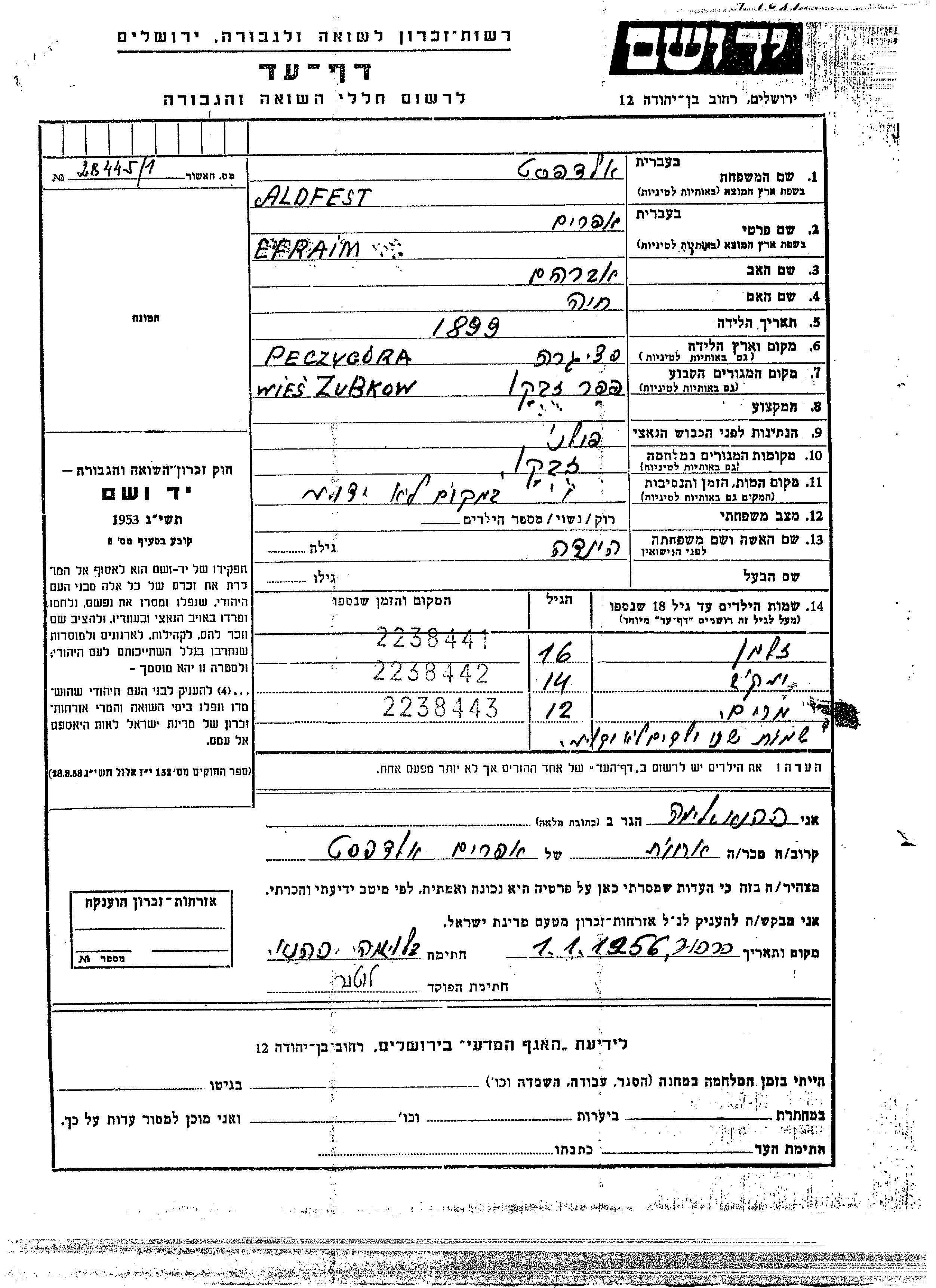 Zalman Aldfest est né à Pieczygory, Pologne, fils de Efraim et de Hinda. Il était Enfant. Avant la seconde guerre mondiale il vivait à Zubkow, Pologne. Au cours de la guerre, il était à Zubkow, Pologne.