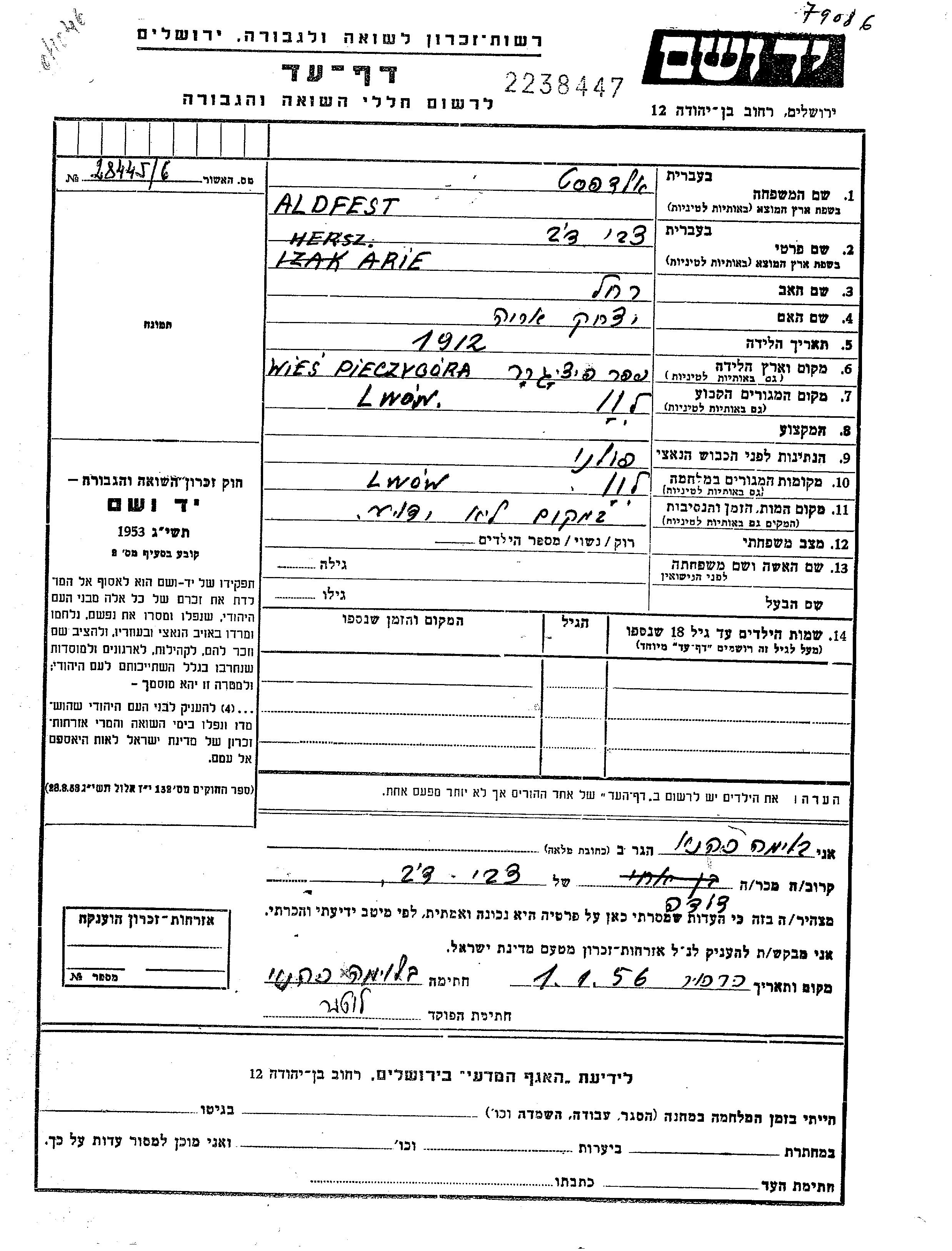 Aldfest Zvi Hersh Dov 1912 Lwow, Pologne Feuille de témoignage