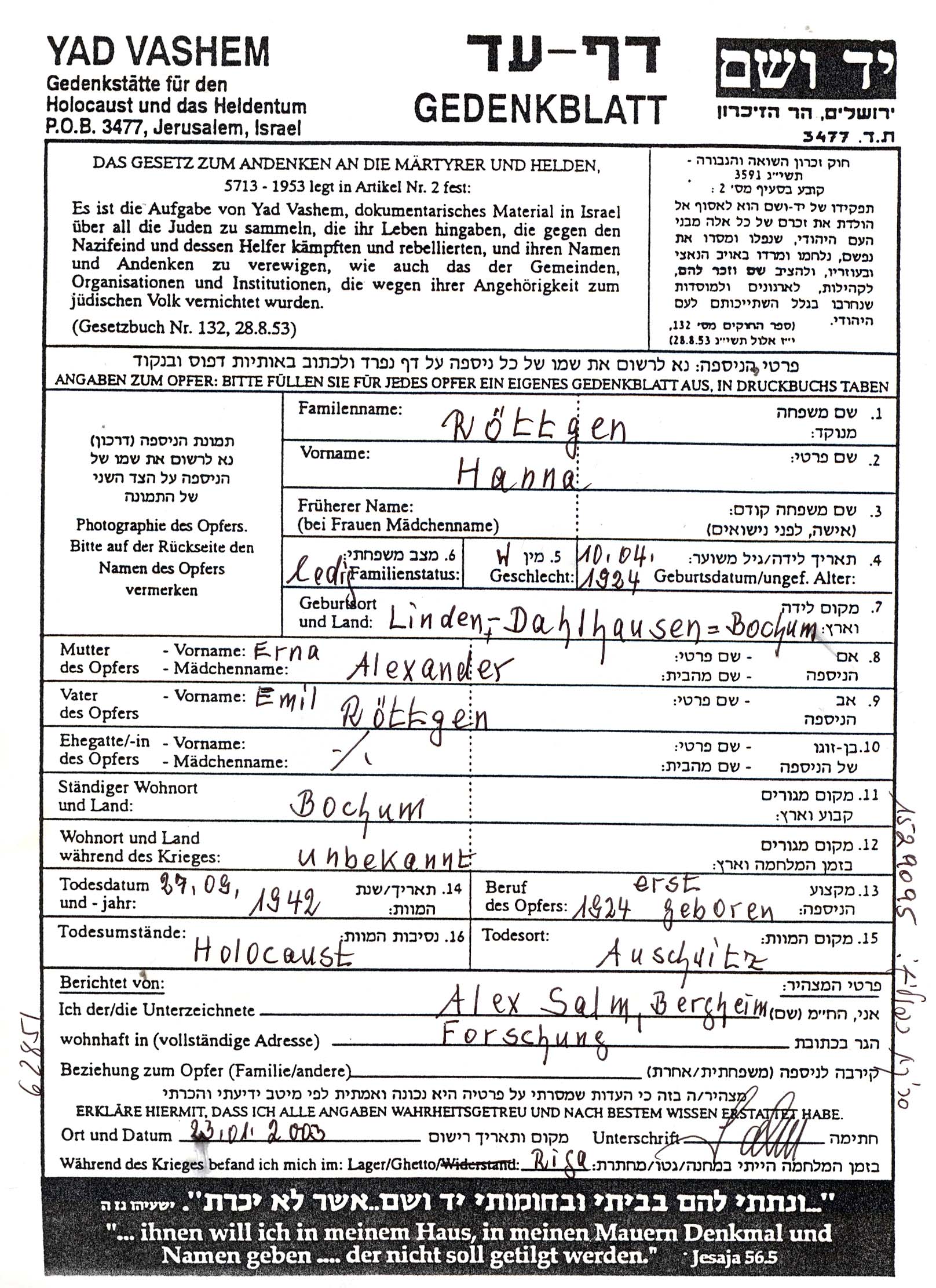 Roettgen Hanna Bochum, Allemagne Feuille de témoignage