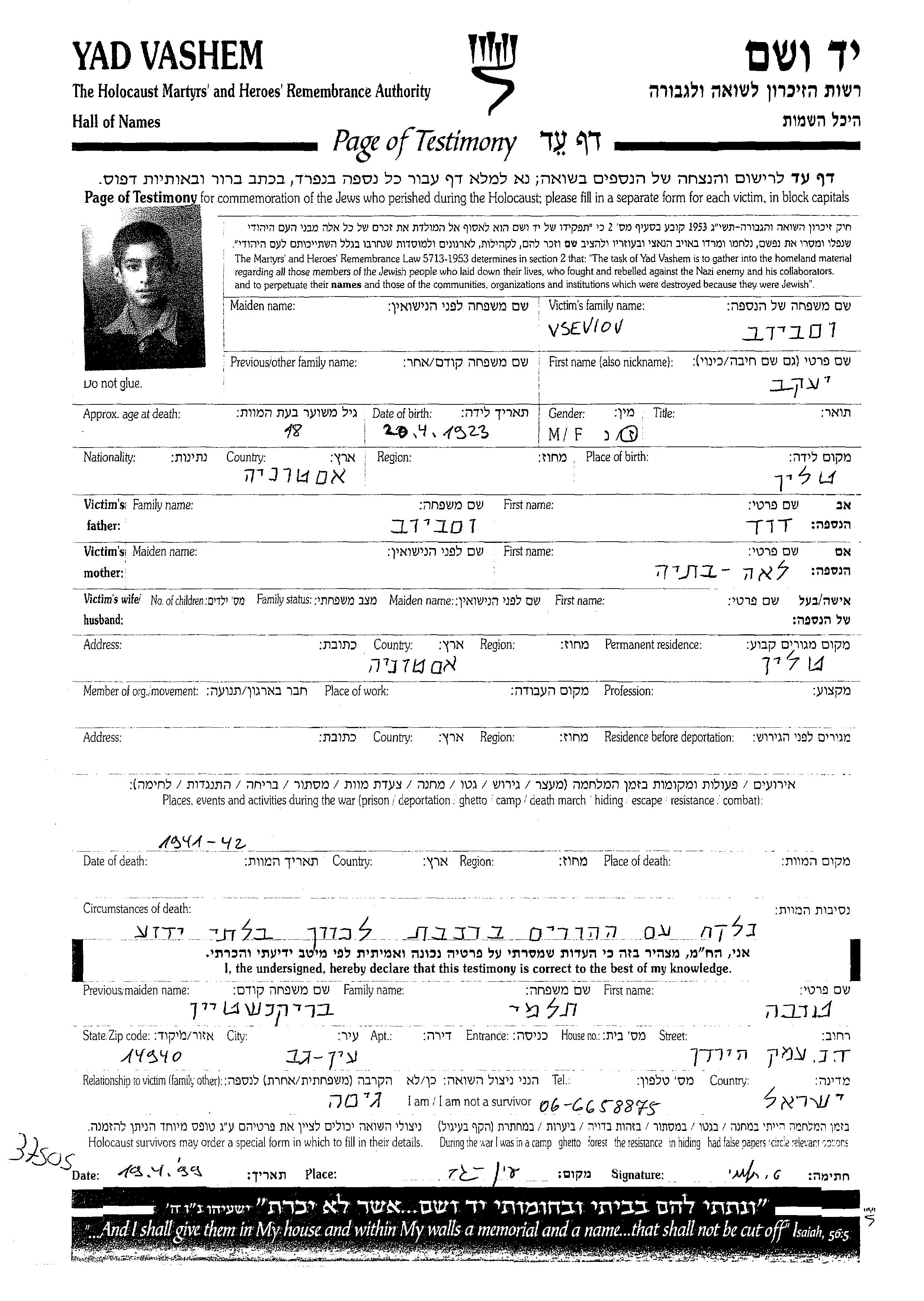 Vseviov | Yaakov | 1923 | Tallin, Estonie | Feuille de témoignage |