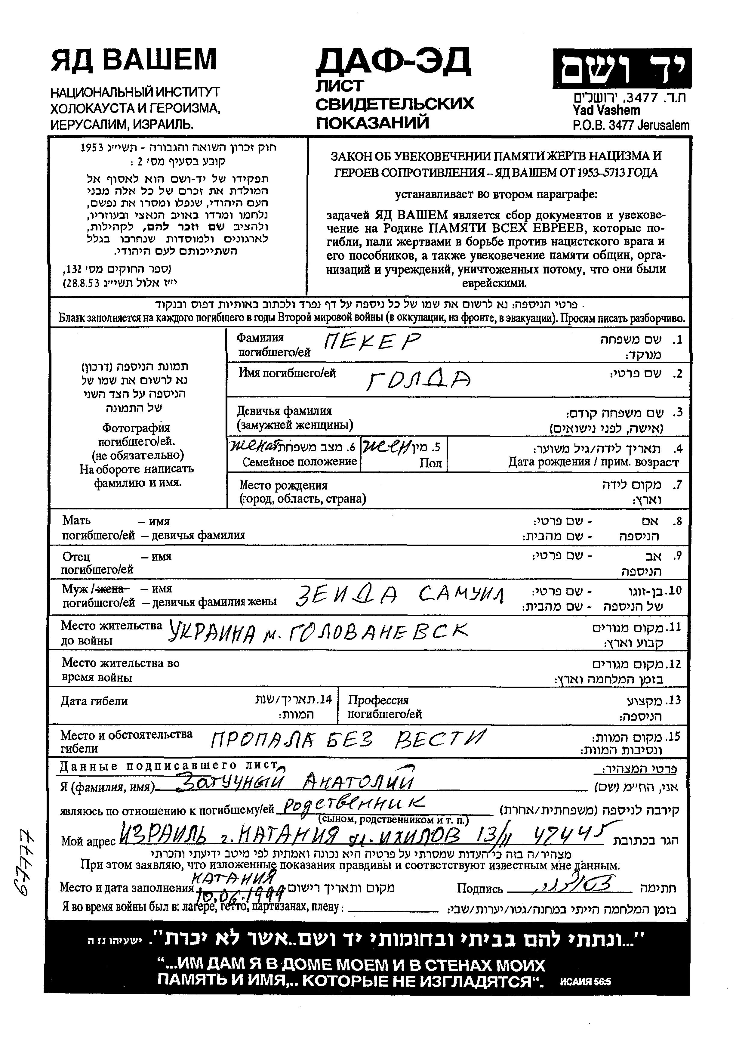 Yad Vashem - Pages of Testimony Names Memorial Collection
