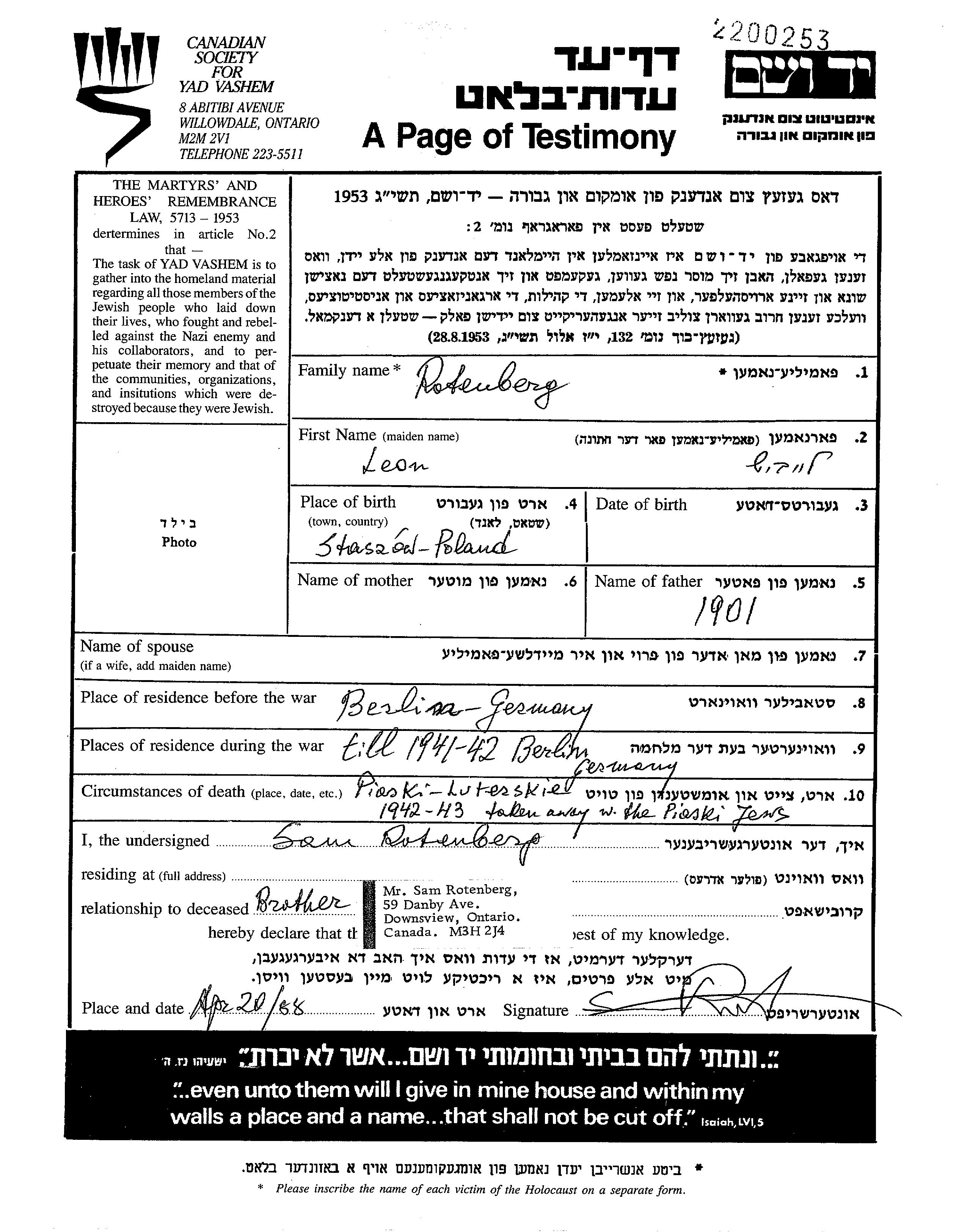 Rotenberg Leib Leon 1890 Berlin, Allemagne Feuille de témoignage