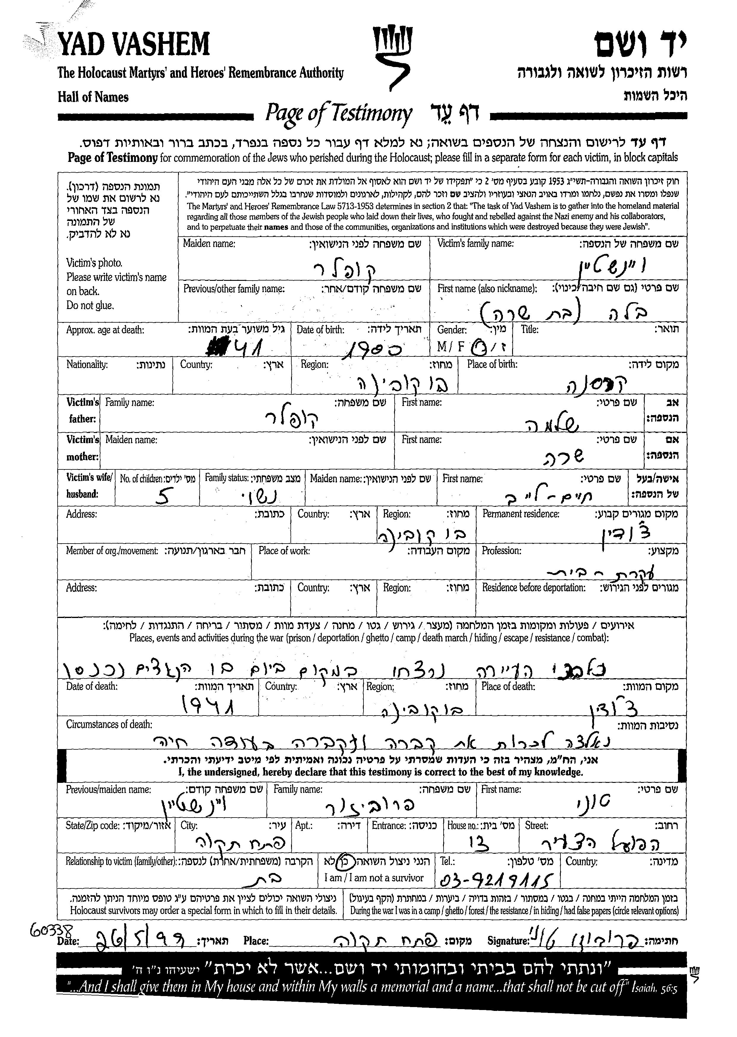 | Weinstein | Bela | 1898 | Ciudin, Roumanie | Feuille de témoignage |