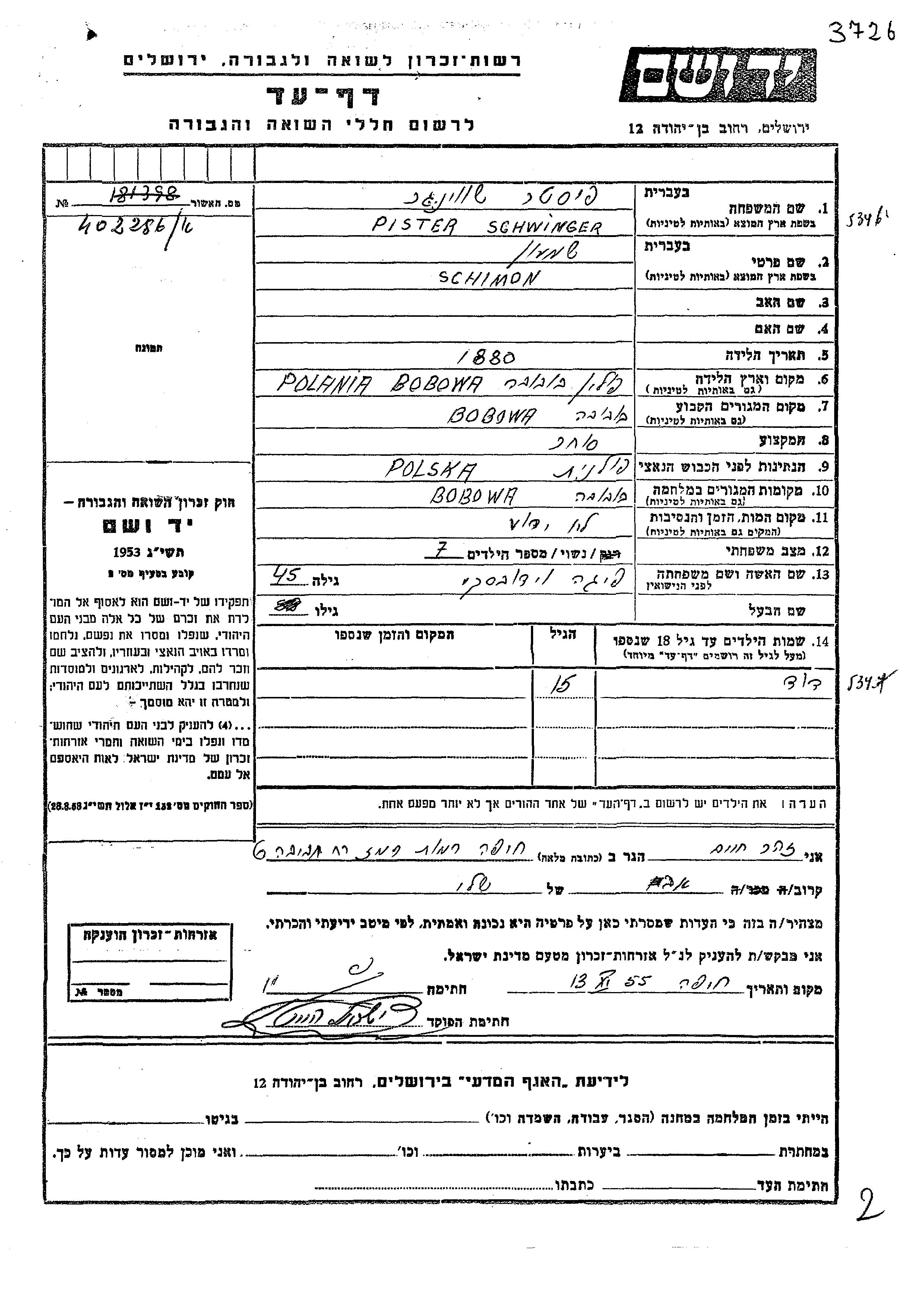 Schwinger Pister David Bobowa, Pologne Feuille de témoignage