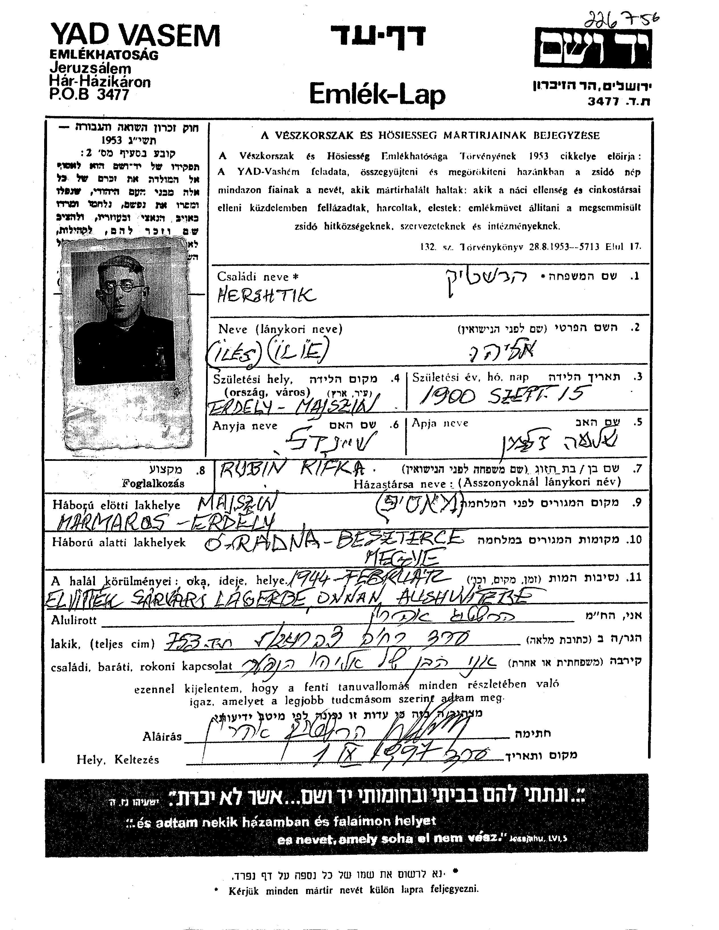 Hershtik | Eliahu | 1900 | Majszin, Roumanie | Feuille de témoignage |