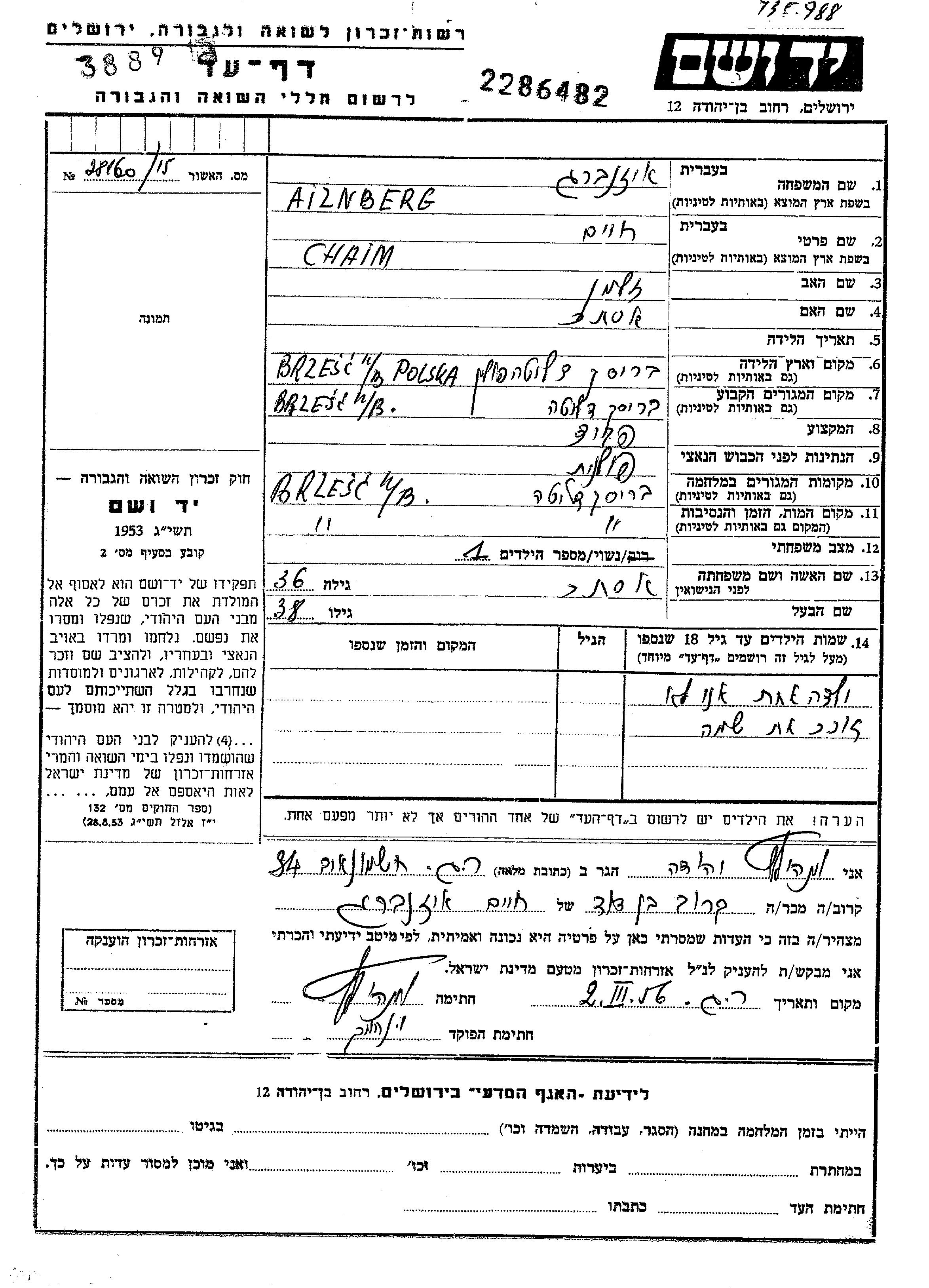 Aizenberg | Chaim | Brześć nad Bugiem, Pologne | Feuille de témoignage | |