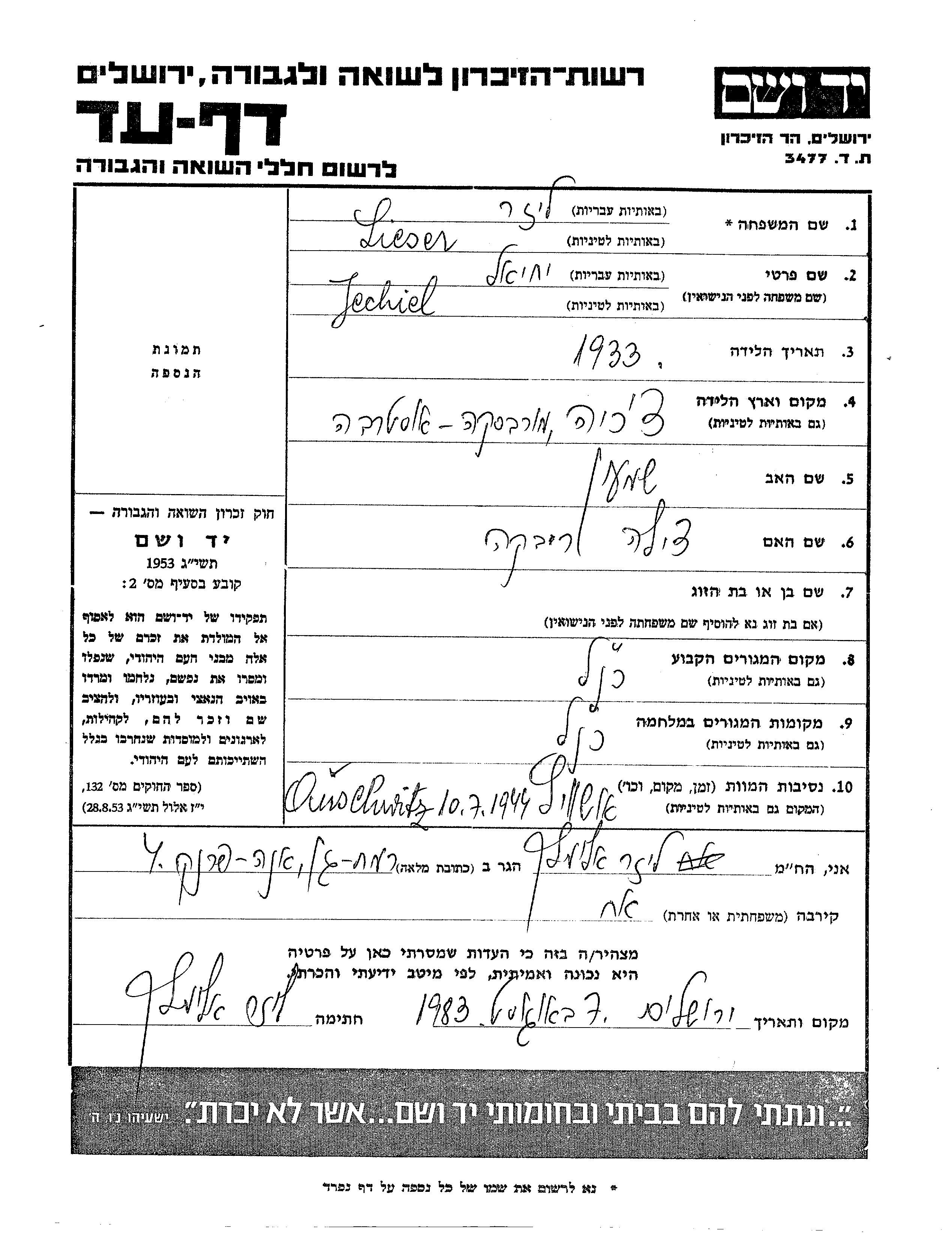 Lieser Jechiel 1933 Moravska Ostrava, Tchécoslovaquie Feuille de témoignage