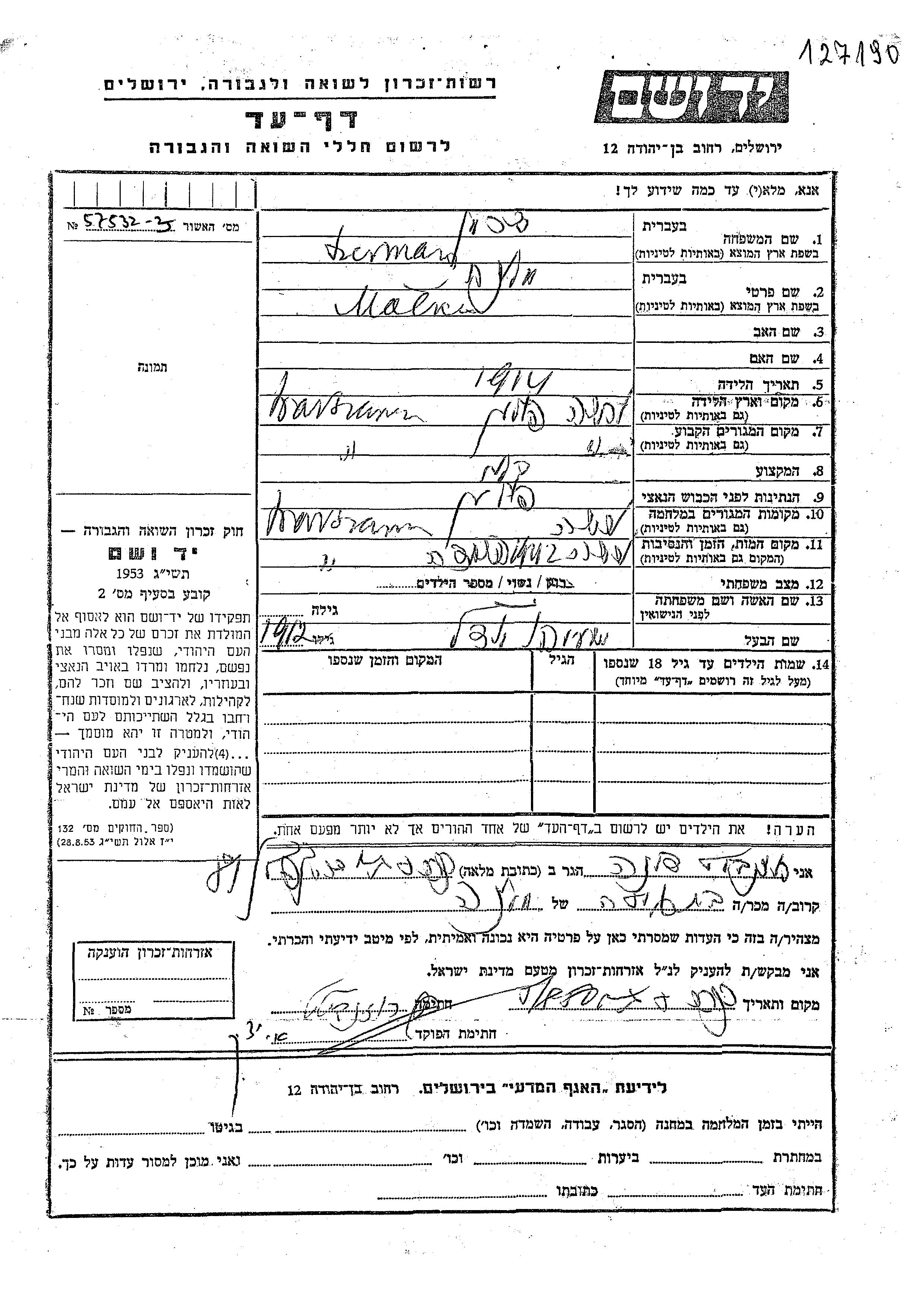 | Szerman | Malka | 1914 | Warszawa, Pologne | Feuille de témoignage |