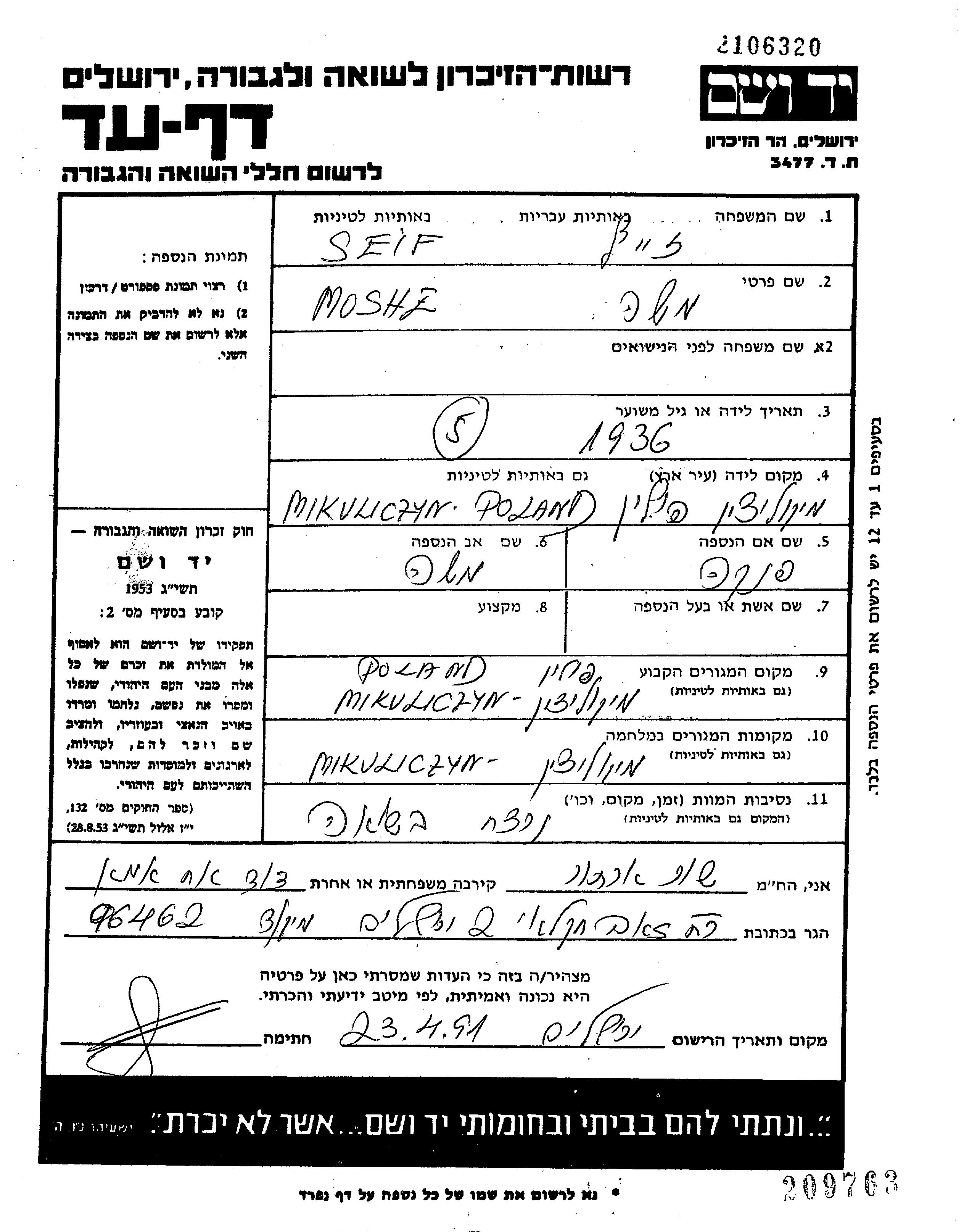 Moshe Zeif Zeitz est né à Mikuliczyn, Pologne en 1936. Avant la seconde guerre mondiale il vivait à Mikuliczyn, Pologne.