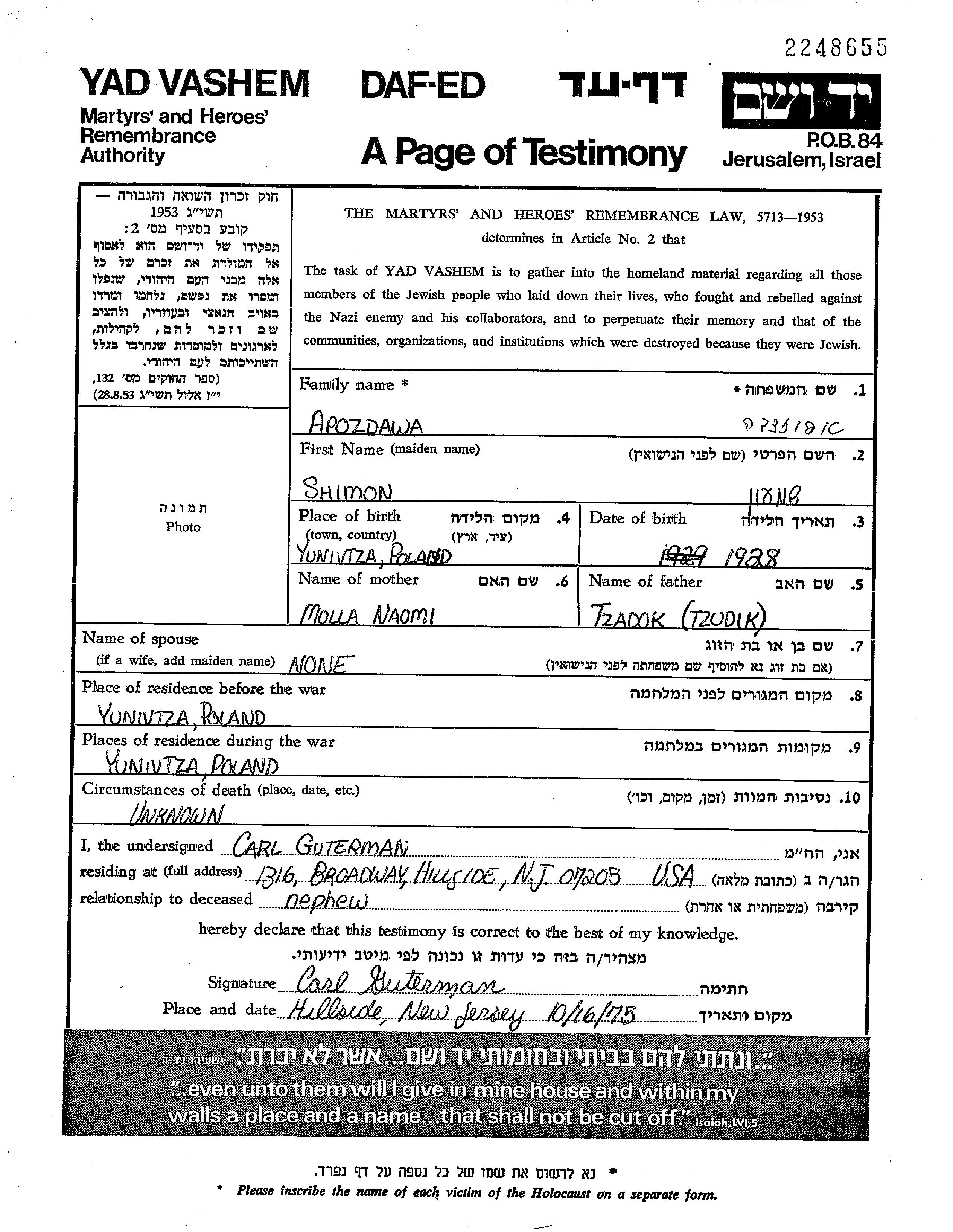 Apozdawa Shimon 1928 Juniewicze , Pologne Feuille de témoignage