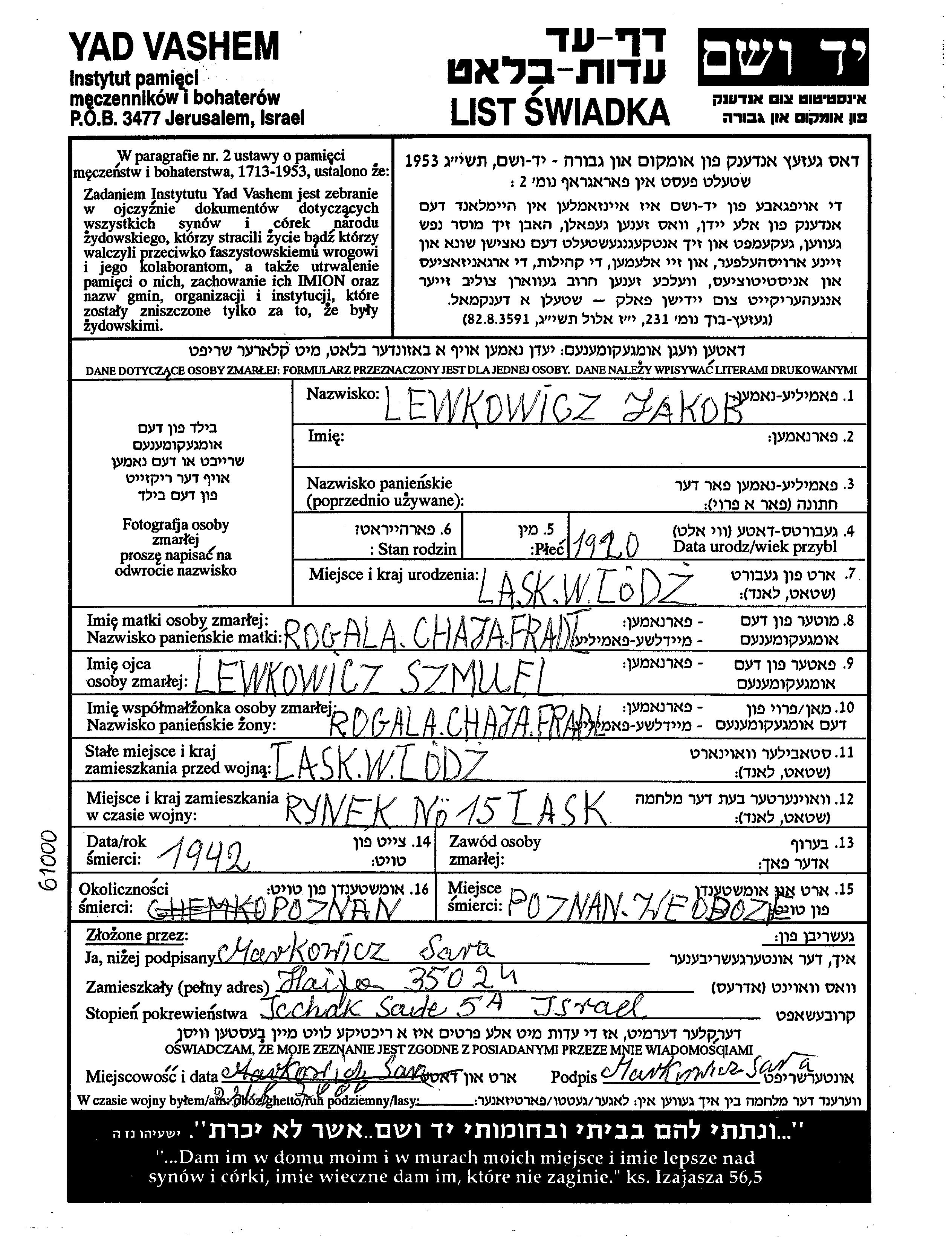 Lewkowich Yaakov Lask, Pologne Feuille de témoignage