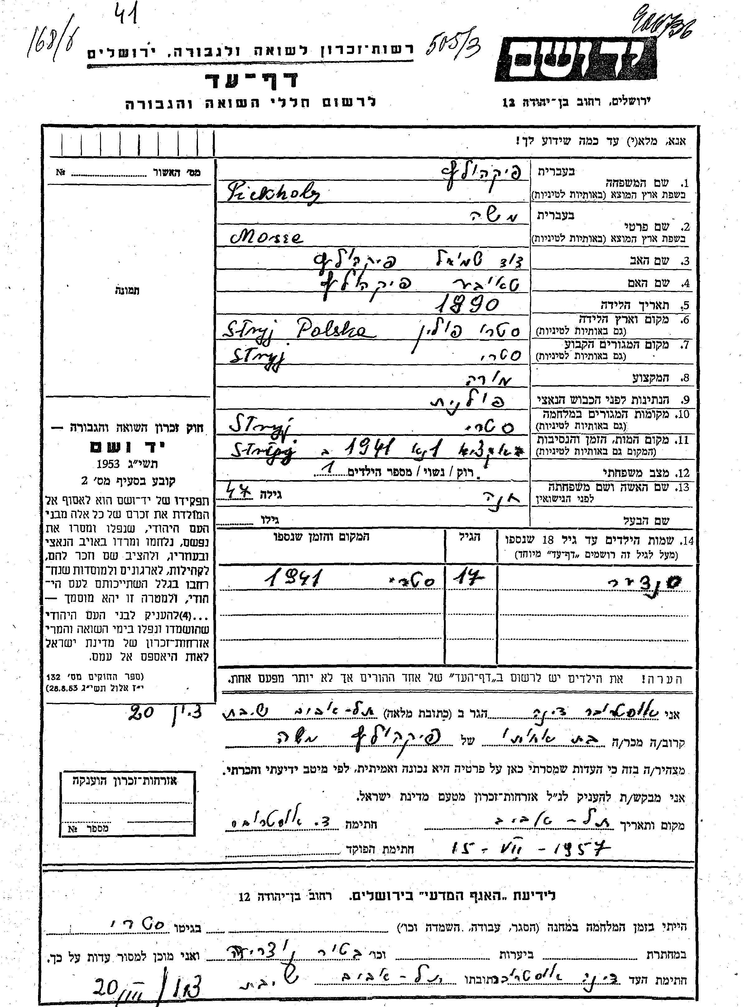 Moshe Pickholz est né à Stryj, Pologne. Il était Enseignant/e. Avant la seconde guerre mondiale il vivait à Stryj, Pologne.